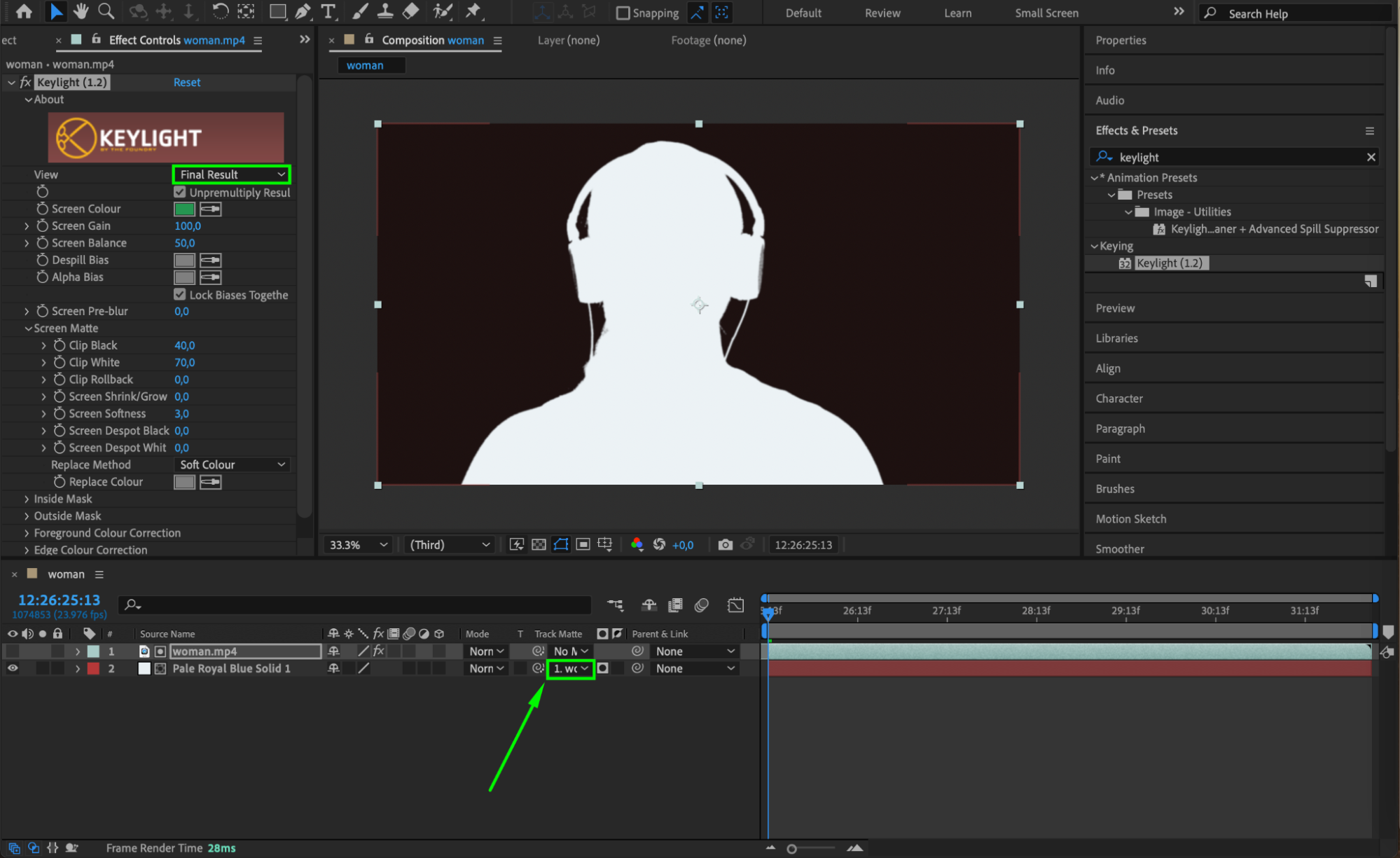 In the Effect Controls panel for your video layer, change the View setting in the Keylight effect to “Final Result.” This will give you the refined silhouette look. Next, for the solid background layer, set the Track Matte to the video layer.