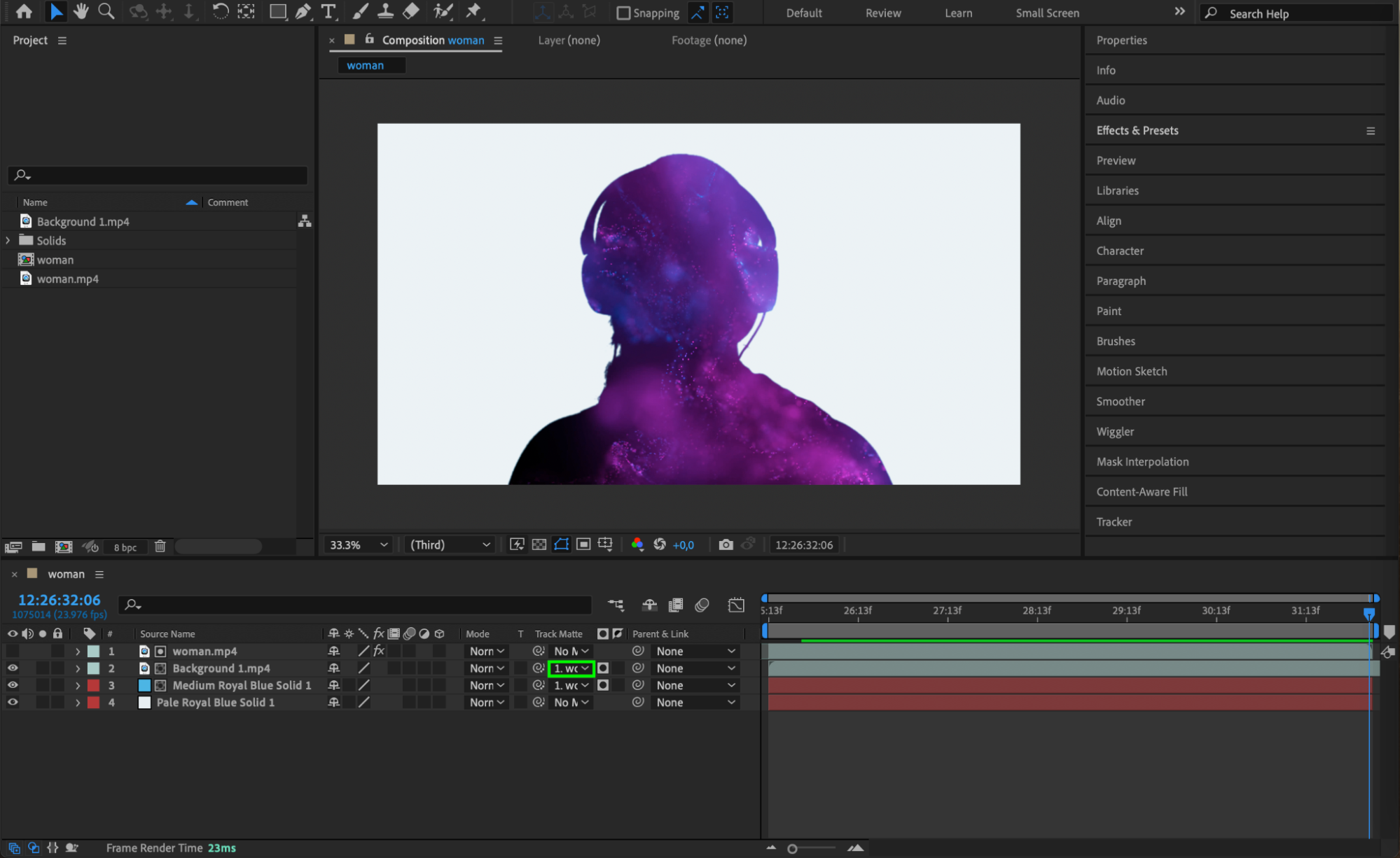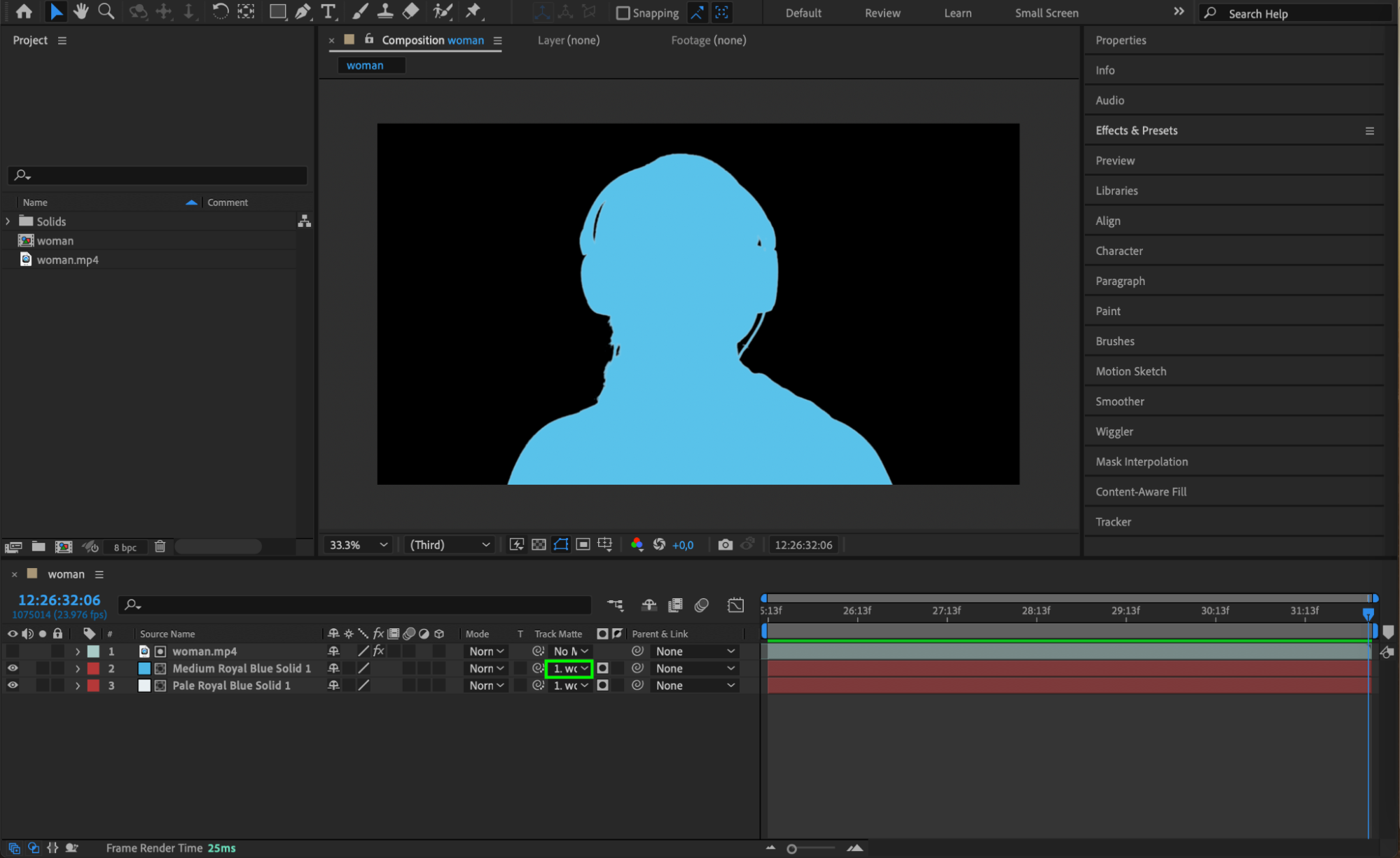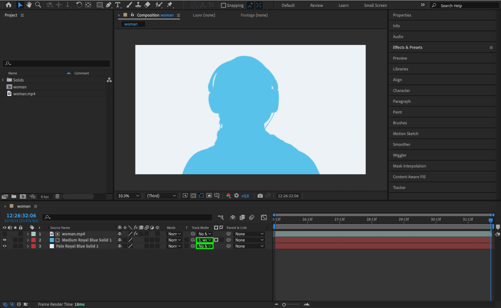 In the Track Matte column for the new solid, select the video layer. This will mask the solid layer to form the silhouette effect, filling the contours of your subject with the chosen color.
