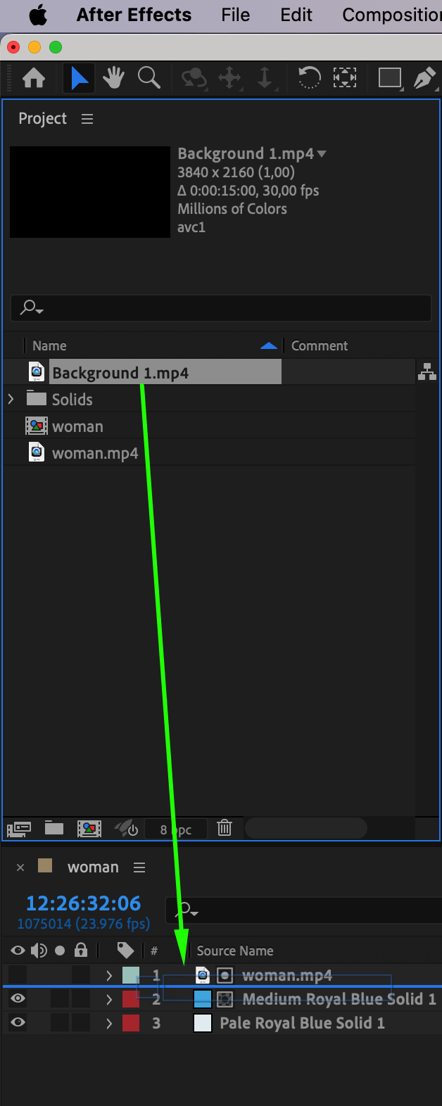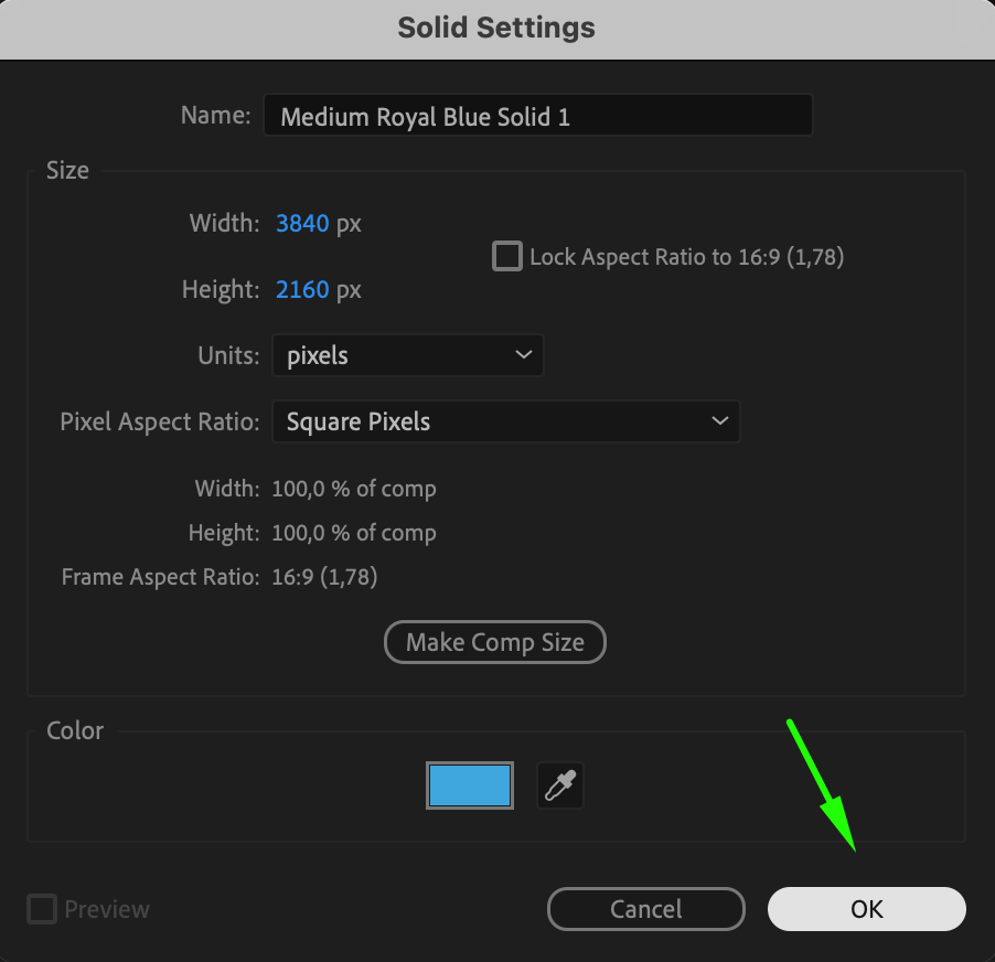 Now, let’s create the actual silhouette. Add a new solid layer by going to Layer > New > Solid, and choose the color you want for the silhouette. This could be blue or any color depending on the visual effect you’re aiming for. Place this layer below the video layer.
