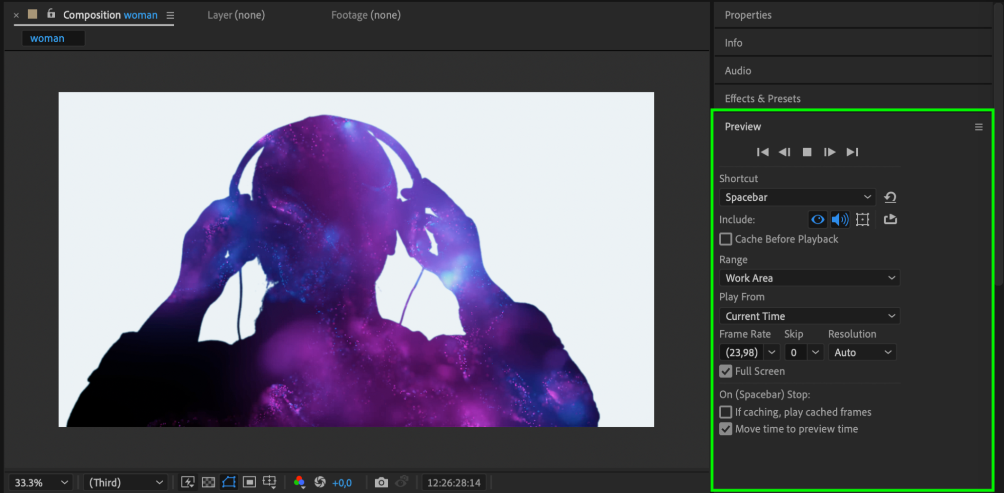 To see your progress, use the Preview panel and play your composition. Adjust any settings if needed, tweaking the Keylight parameters or the color of your silhouette to ensure it looks just right.