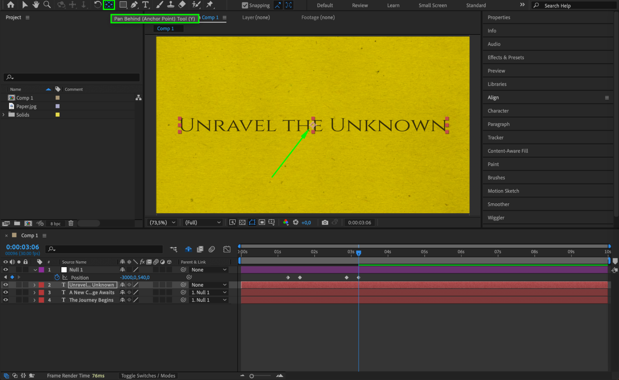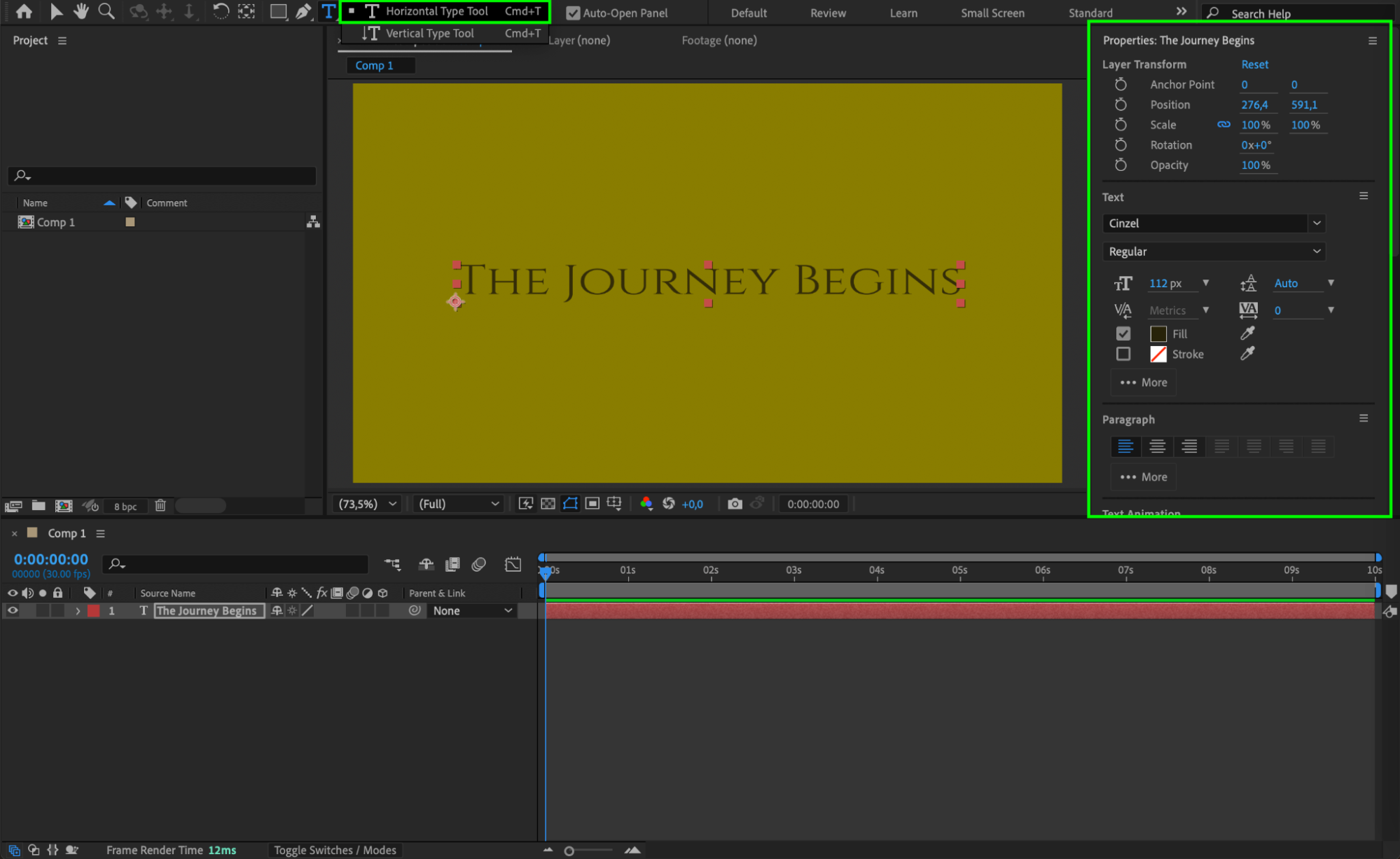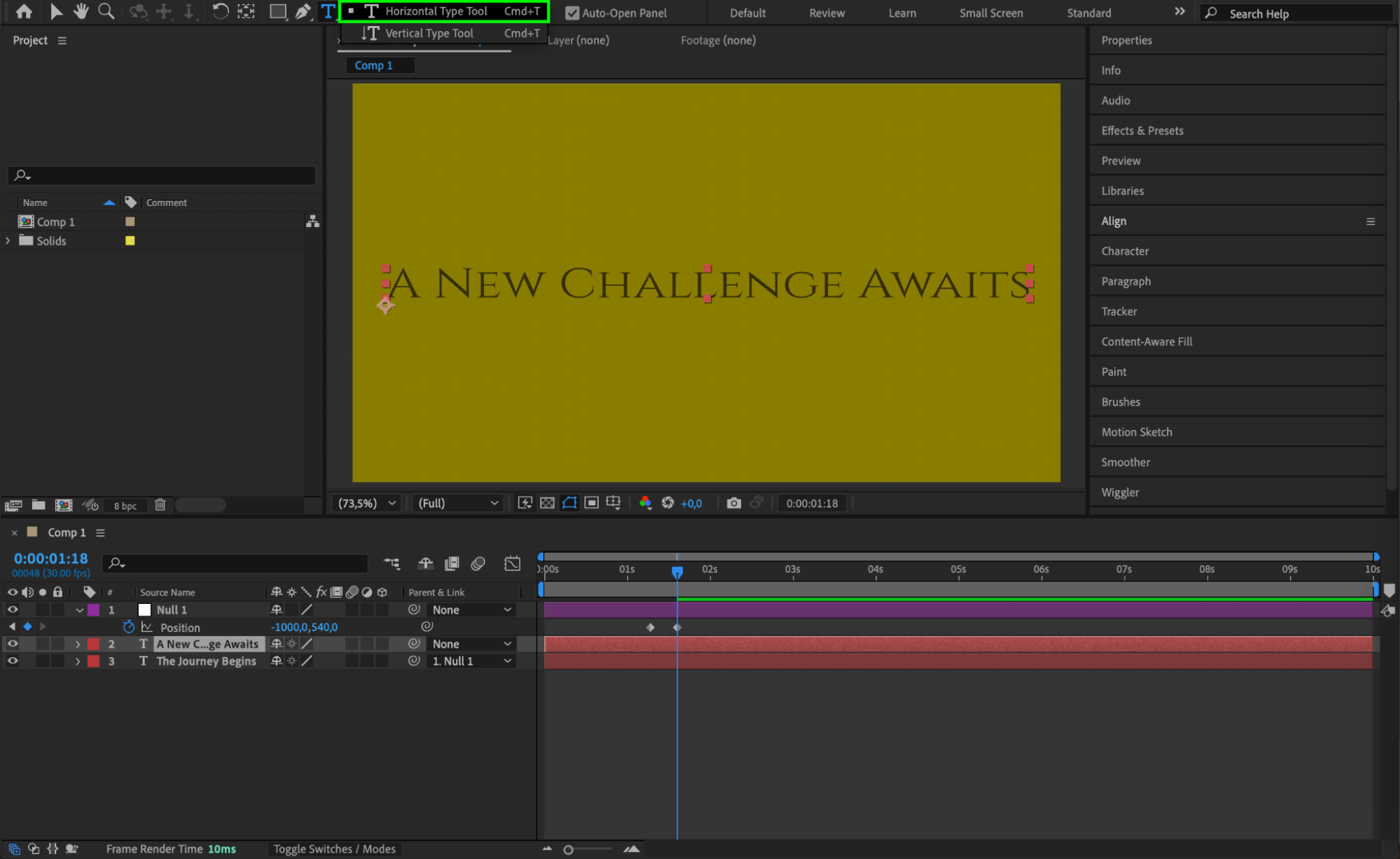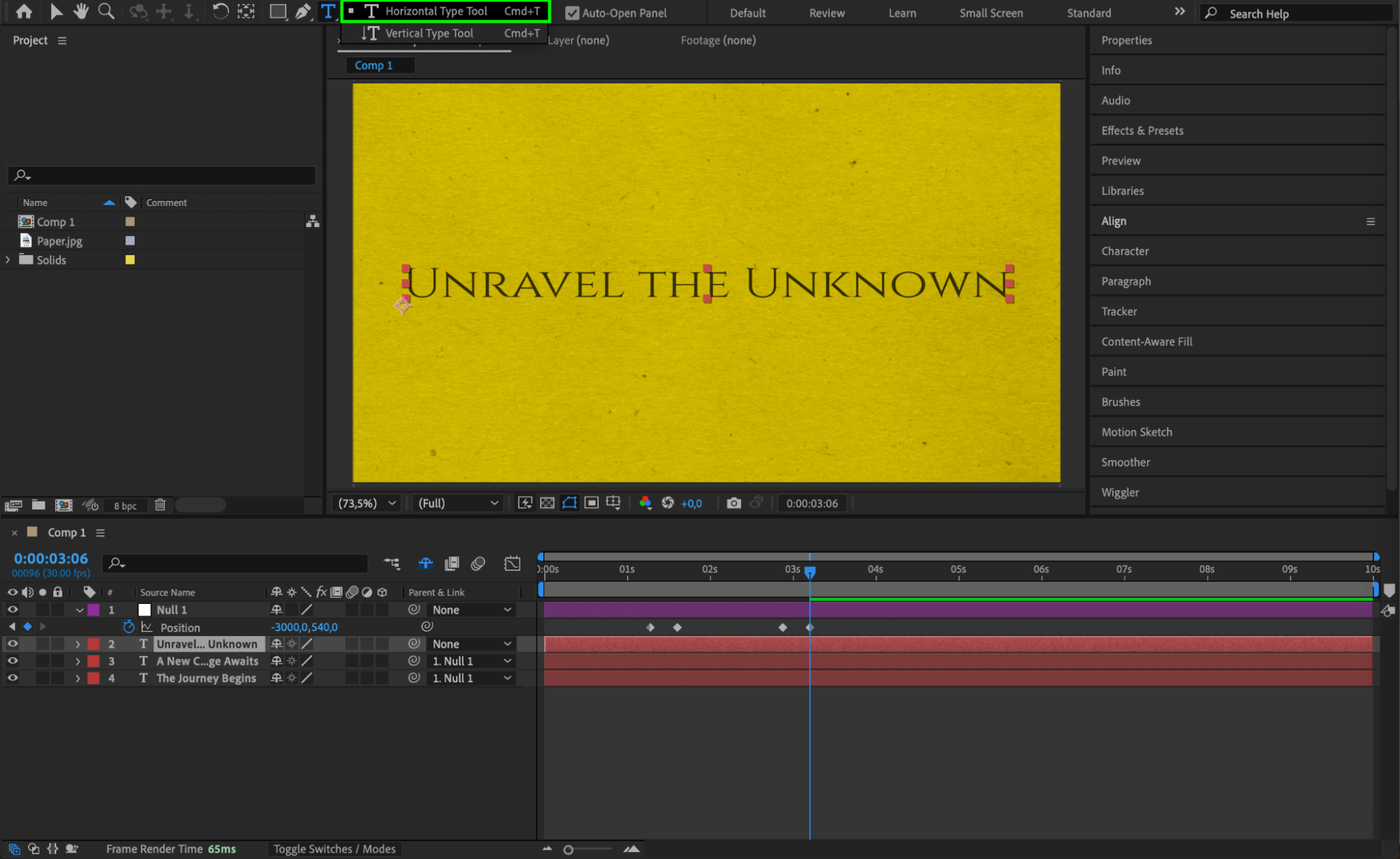 To add text, select the Text Tool (Ctrl/Cmd + T) from the toolbar. Click in the composition panel and type your title. Adjust the font, size, and alignment from the Character and Paragraph panels. Center the text both horizontally and vertically.
