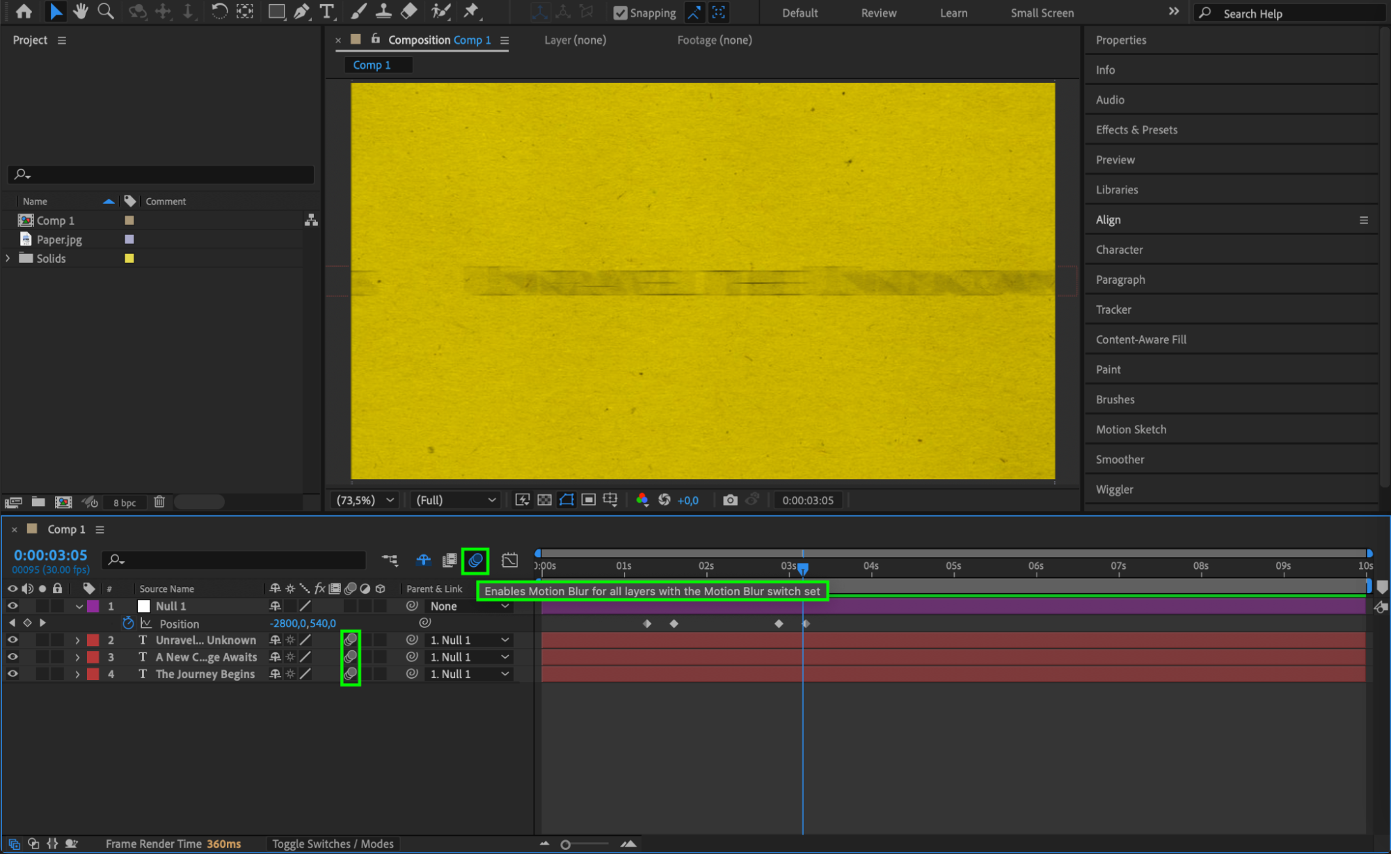 Enable Motion Blur for the entire composition by clicking the Motion Blur toggle at the top of the Timeline Panel.