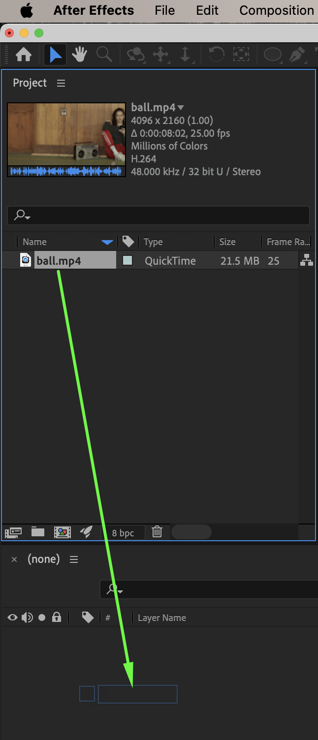 Go to File → Import → File and select your video. Drag the video onto the timeline to create a new composition.
