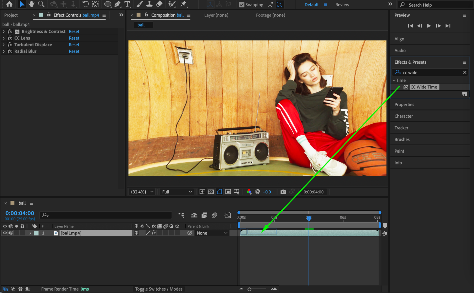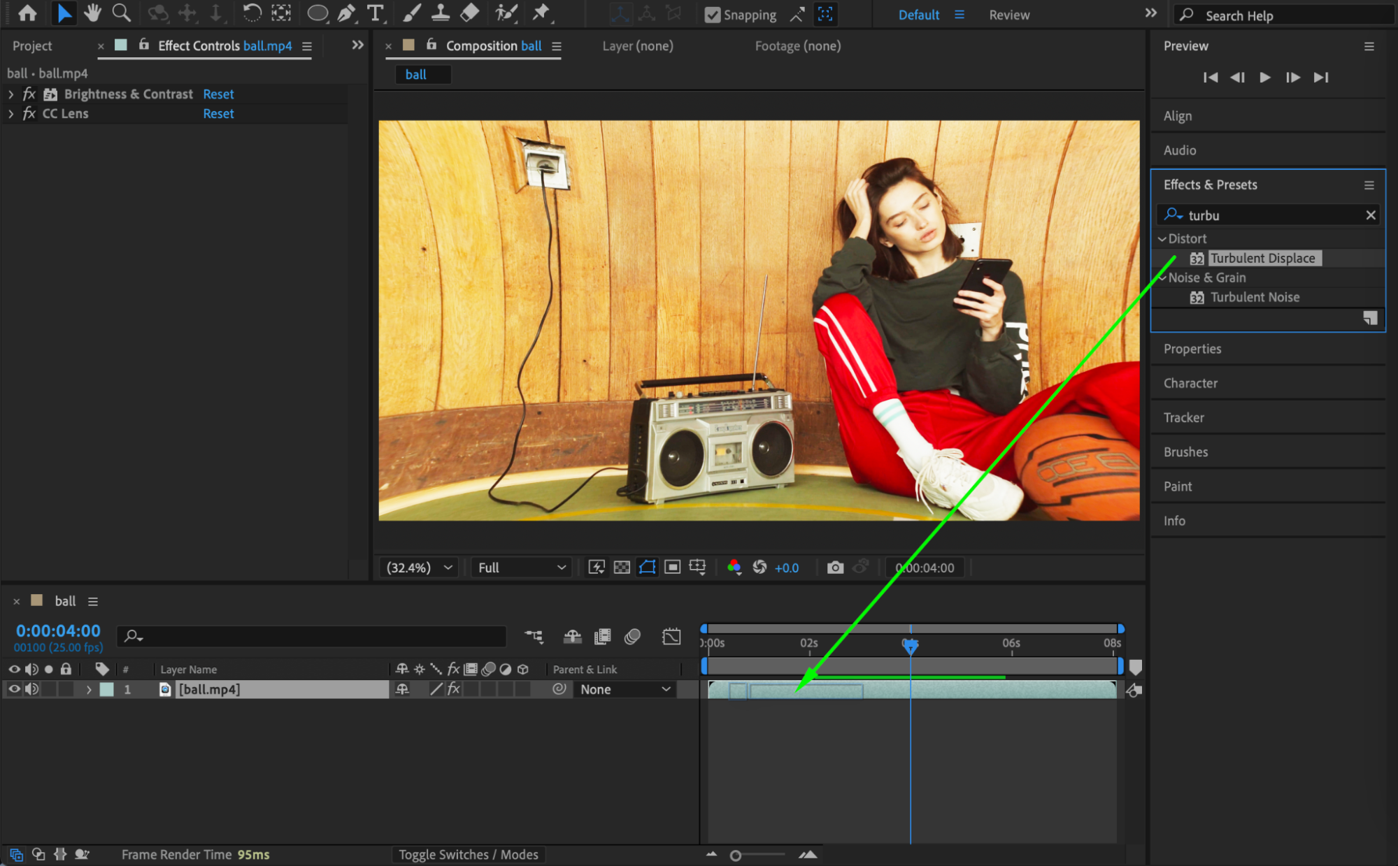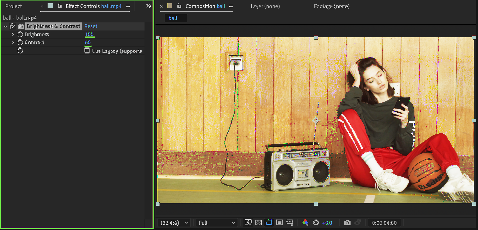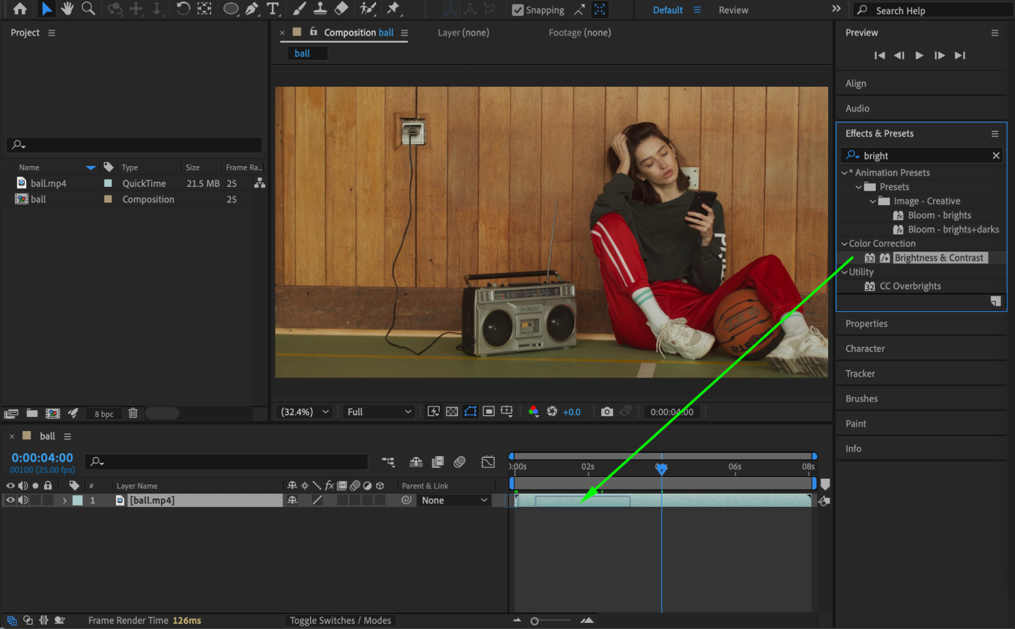 From the Effects & Presets panel, add Brightness & Contrast. Set: