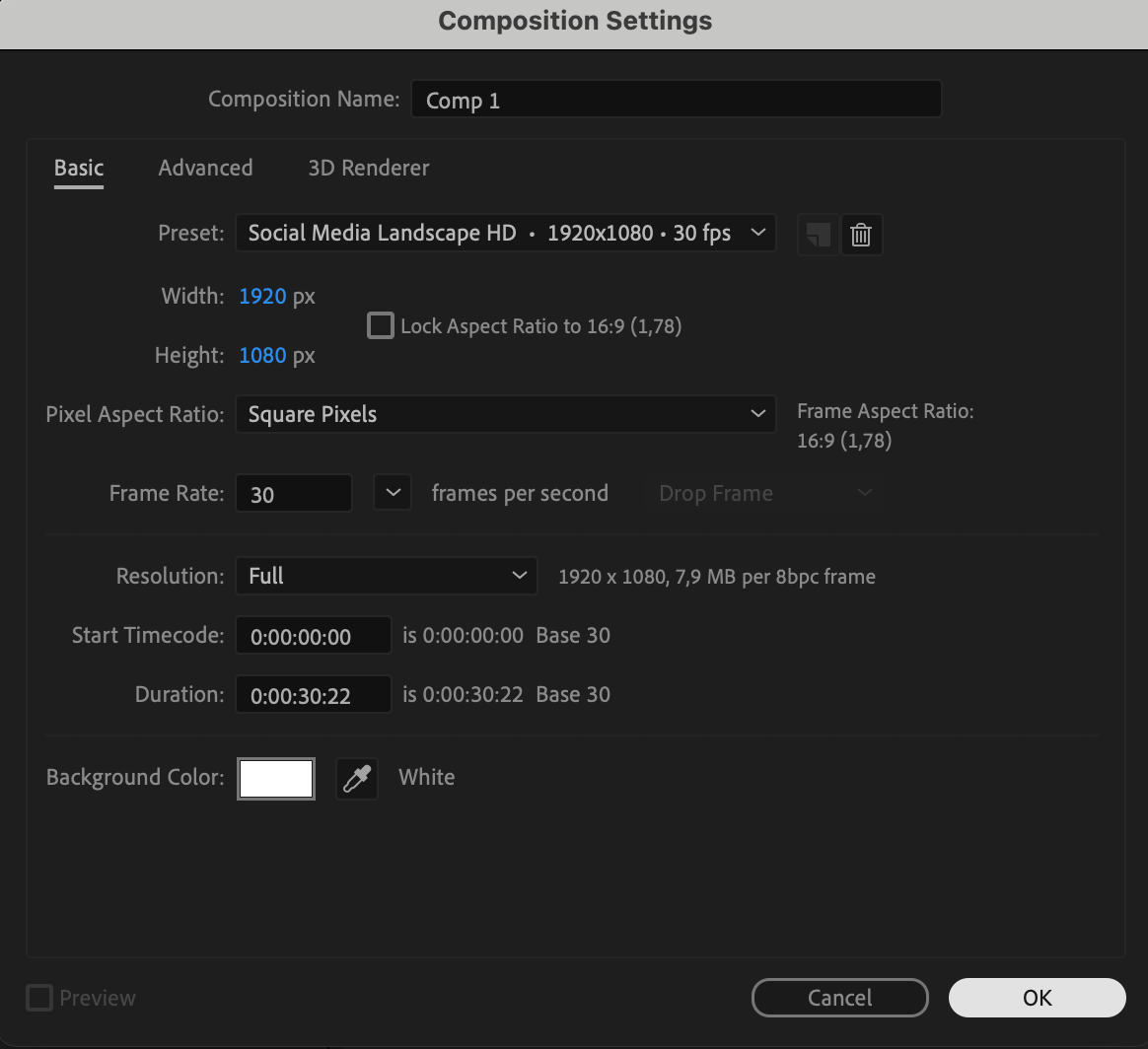 Start by creating a new composition. Go to Composition > New Composition and set the resolution to 1920×1080 pixels with a frame rate of 30fps. Choose a duration of about 30–60 seconds, depending on your video’s length. This will be the base of your wedding invitation.
