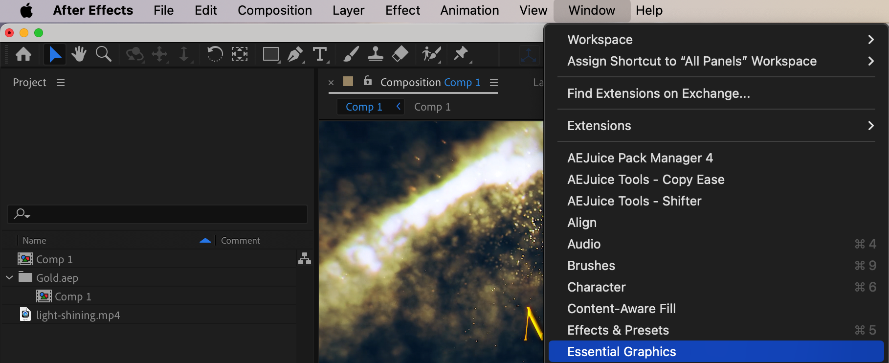 Go to the top menu and navigate to Window > Essential Graphics to open the Essential Graphics panel. This panel allows you to set up the customizable elements in your project that users can modify later on, such as text, colors, and other key elements of your design.