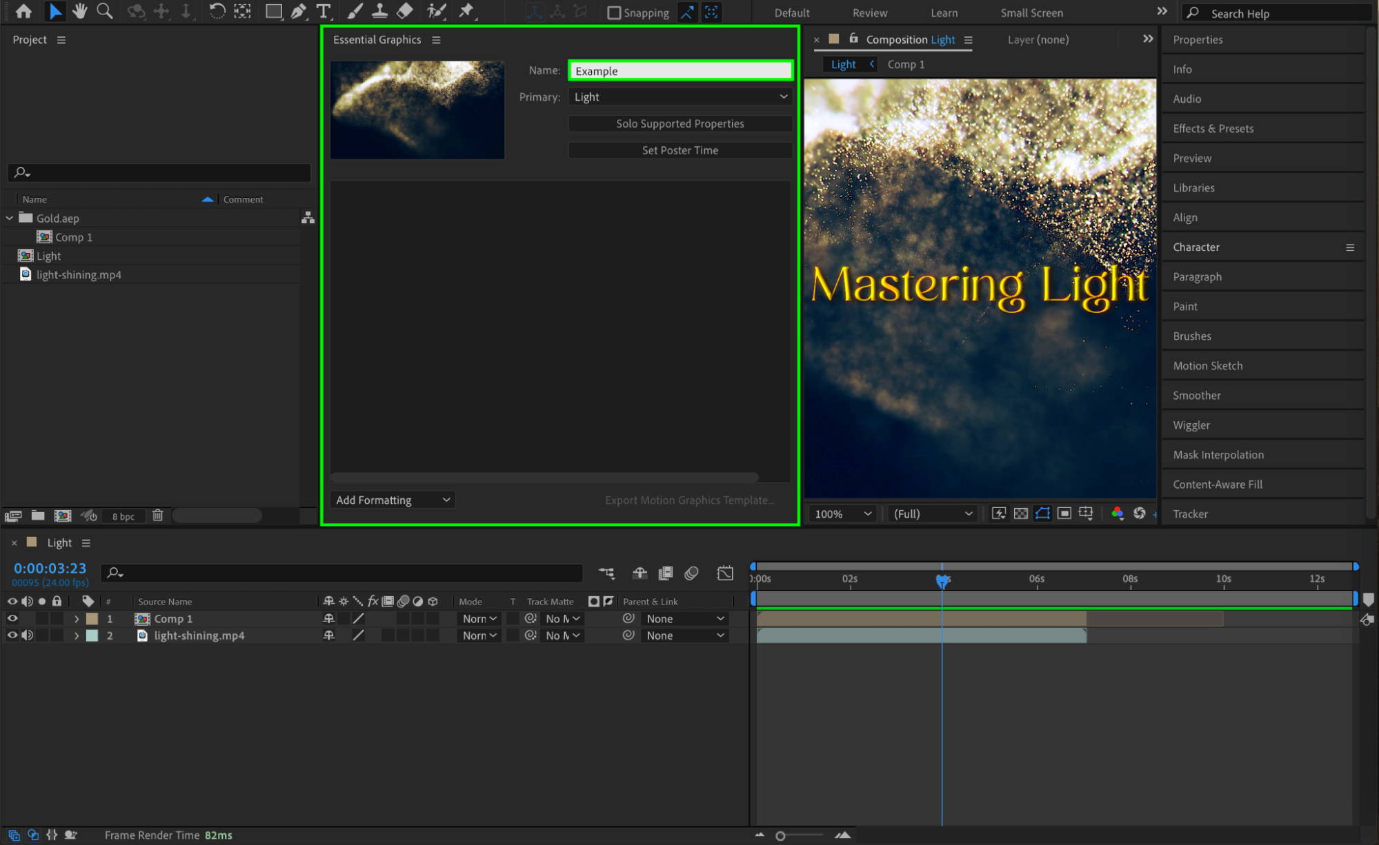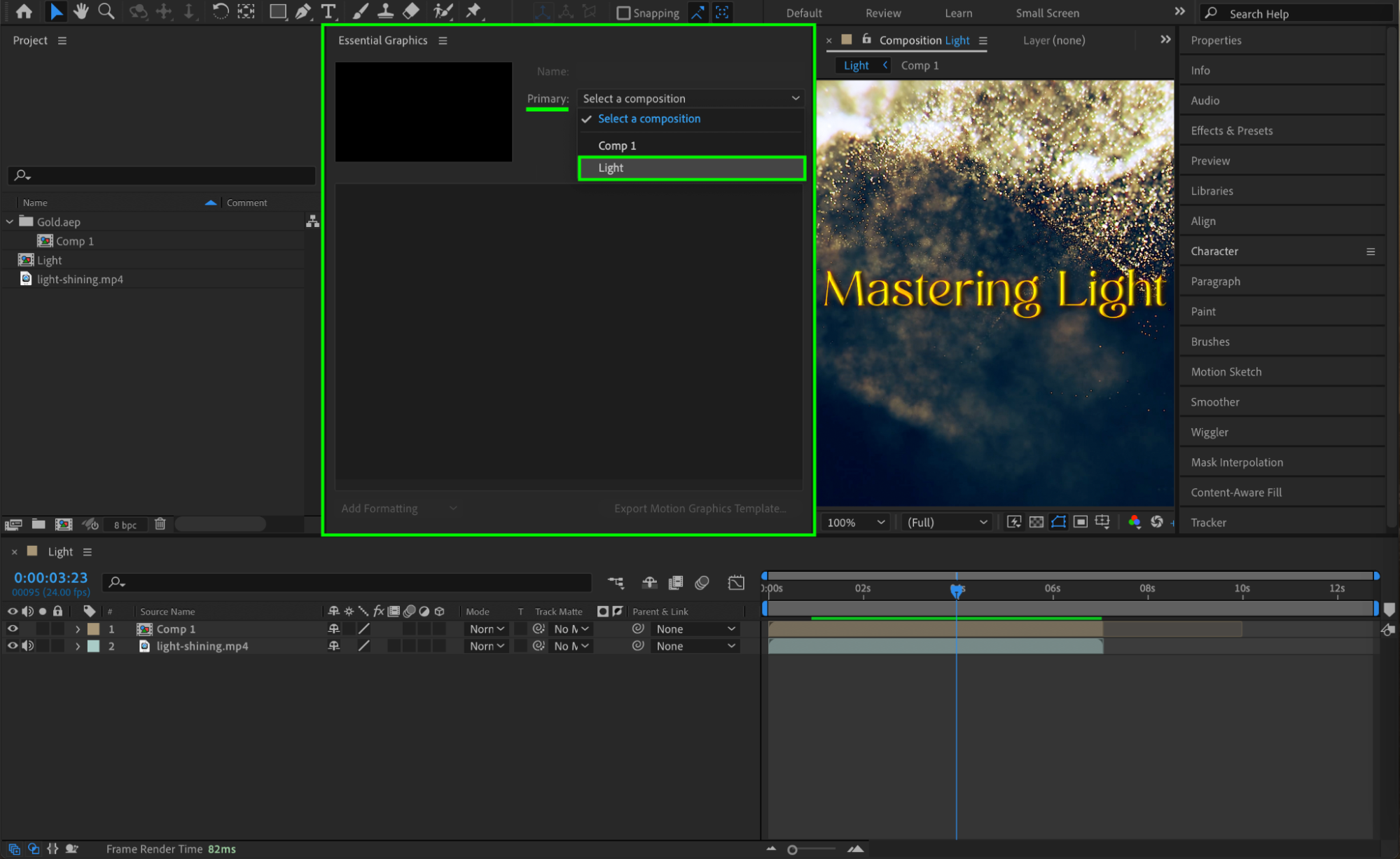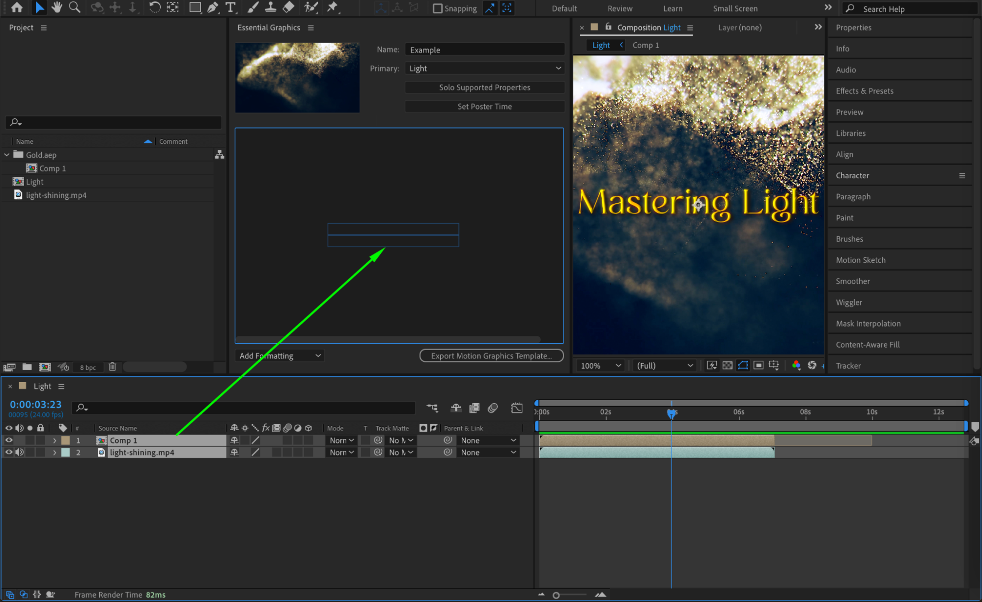 Now that your composition is selected, it’s time to define which elements in the template will be editable. Drag and drop the properties you want to be customizable, such as text, color controls, or slider values, from the timeline into the Essential Graphics panel. This will allow users of your template to easily adjust these properties without altering the core design.