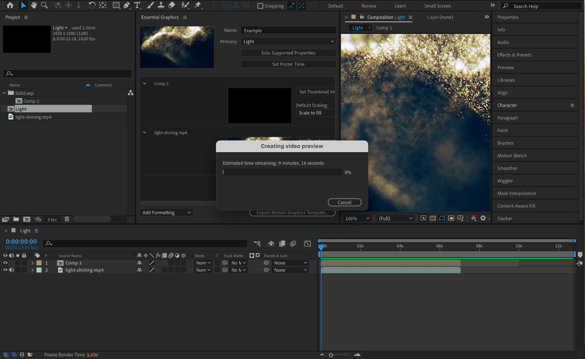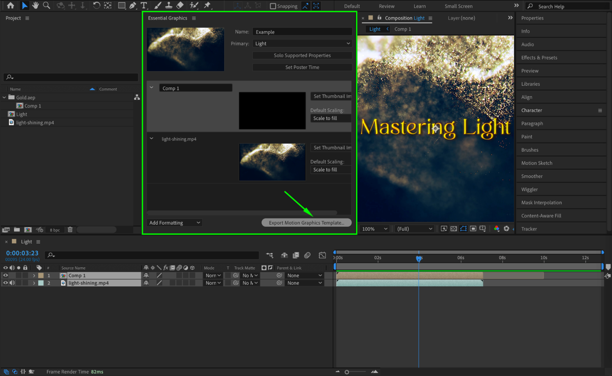 Once you’ve set up your customizable properties, it’s time to export the template. In the Essential Graphics panel, click on the Export Motion Graphics Template button. A progress bar will appear as After Effects processes your project and creates the template file.