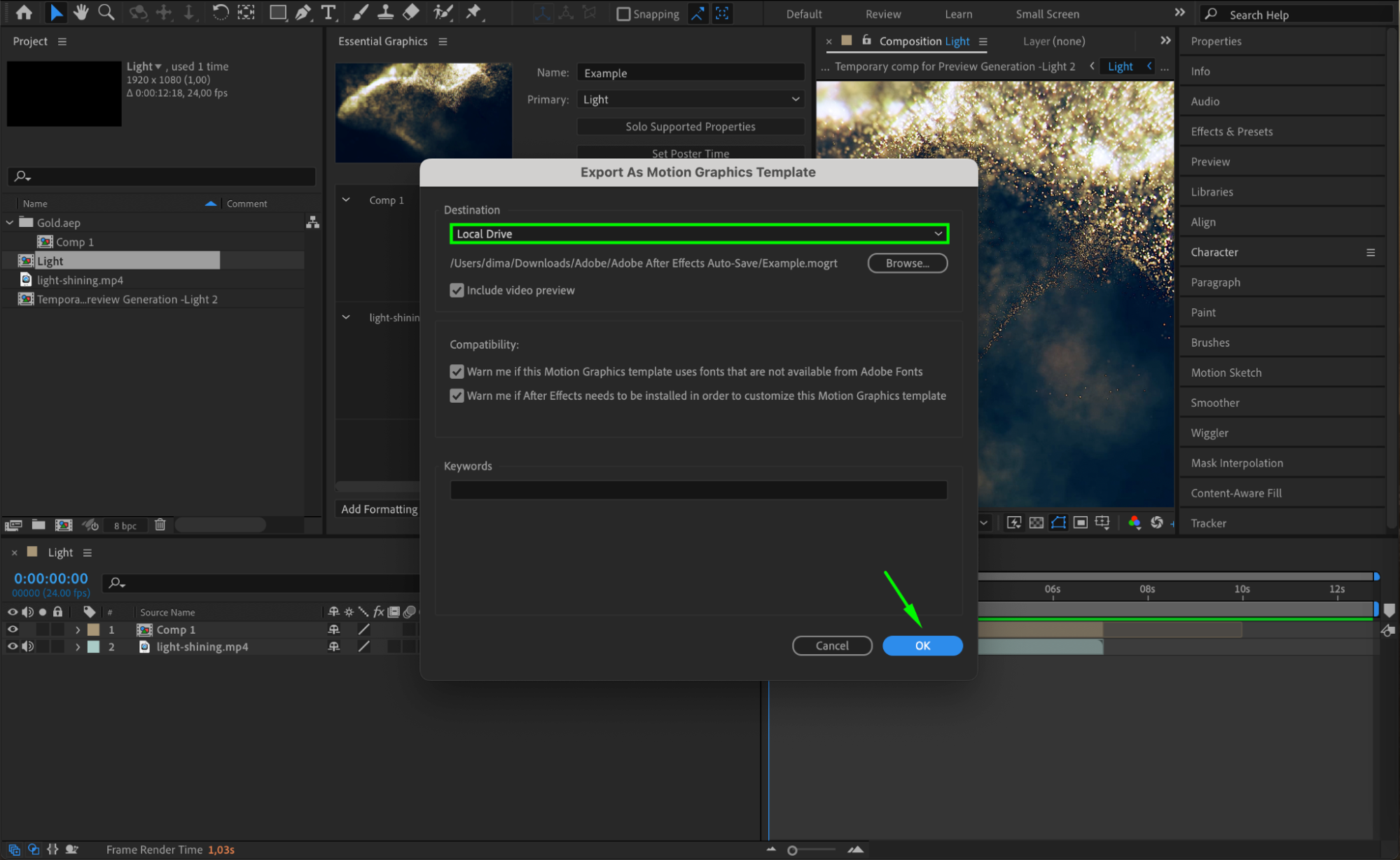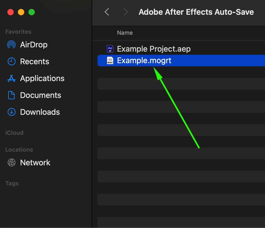 Your exported template will be saved in the .mogrt (Motion Graphics Template) format. This file type is compatible with both After Effects and Adobe Premiere Pro, allowing for easy integration and reuse across multiple video projects. Check the exported file to ensure it’s saved correctly.