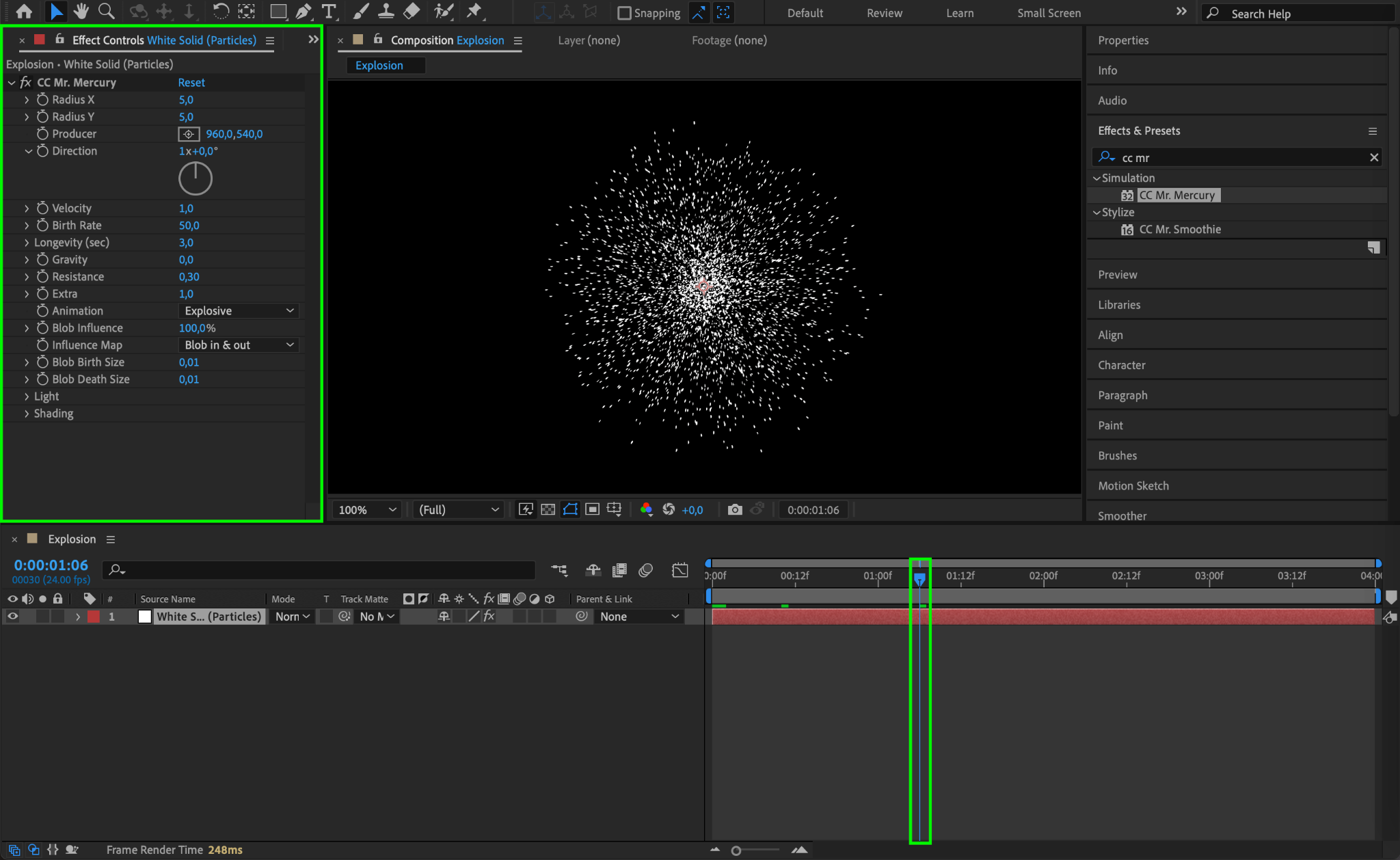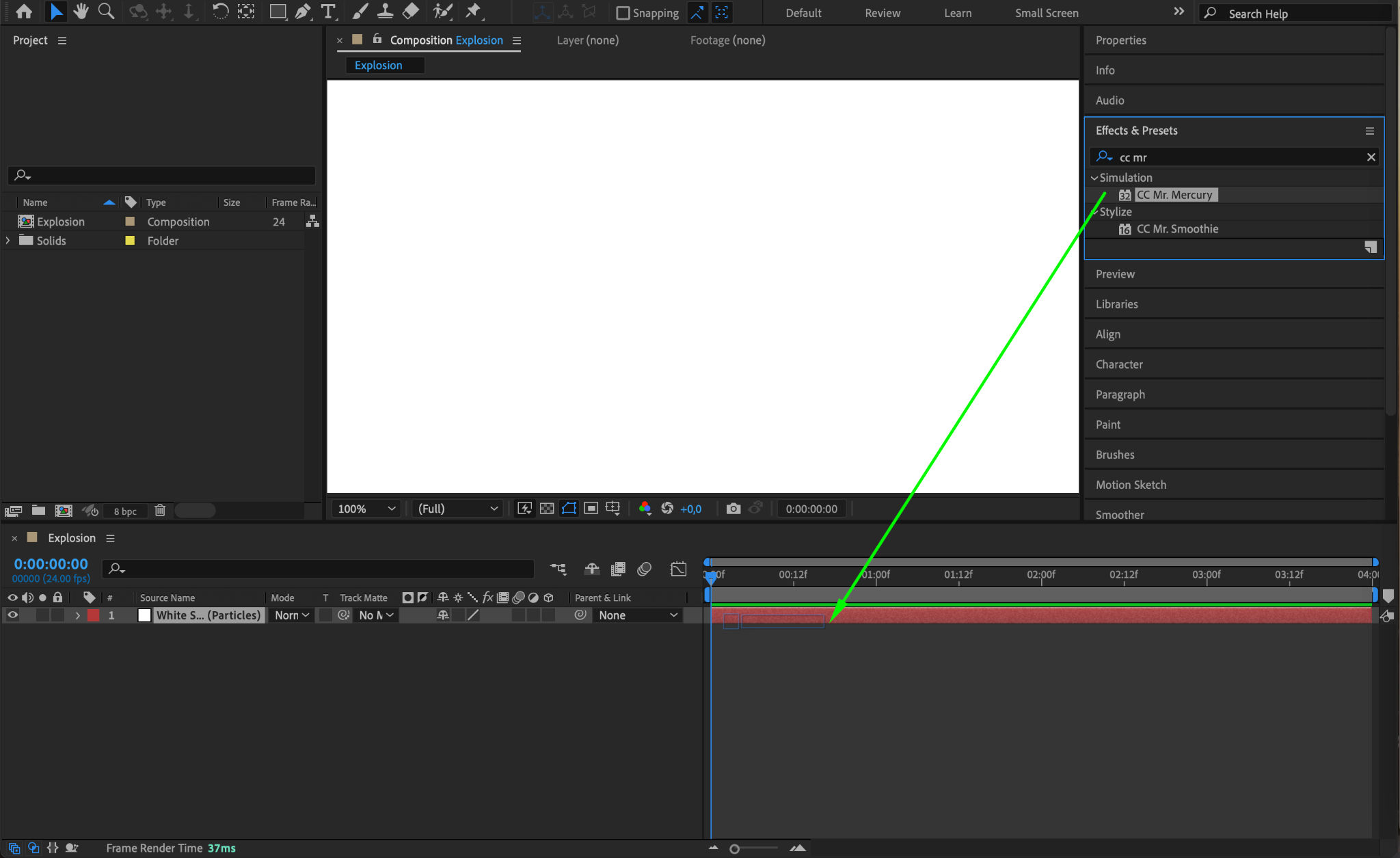 In the Effects & Presets panel, search for the CC Mr. Mercury effect and apply it to your solid layer. This effect will generate the fluid-like particles that form the explosion.