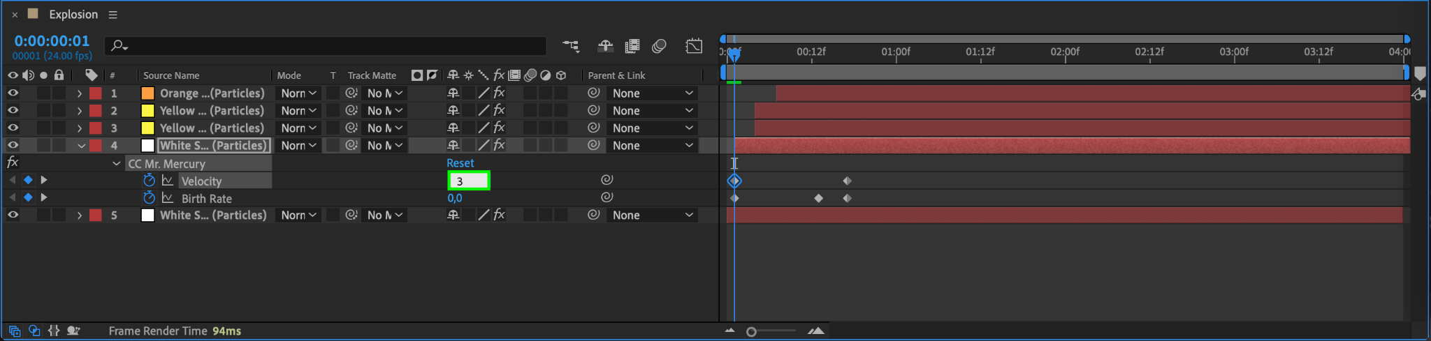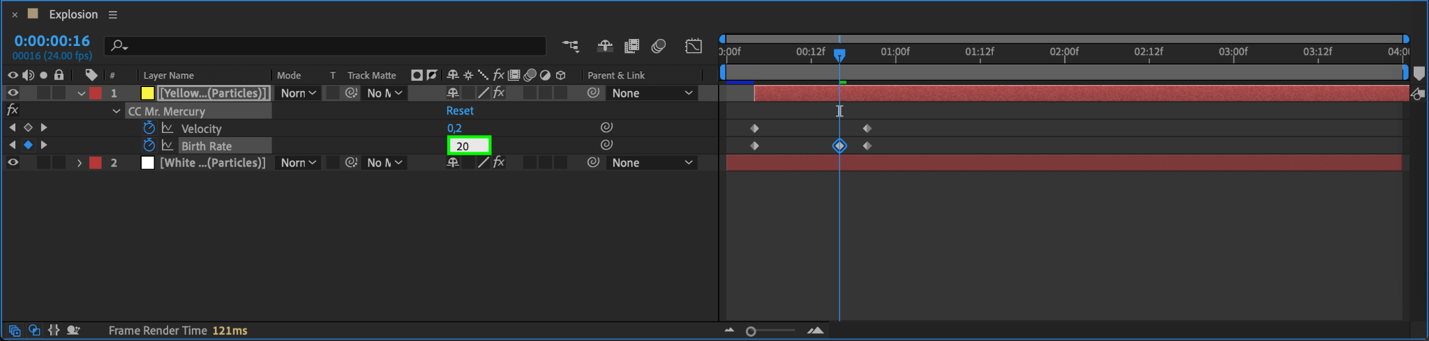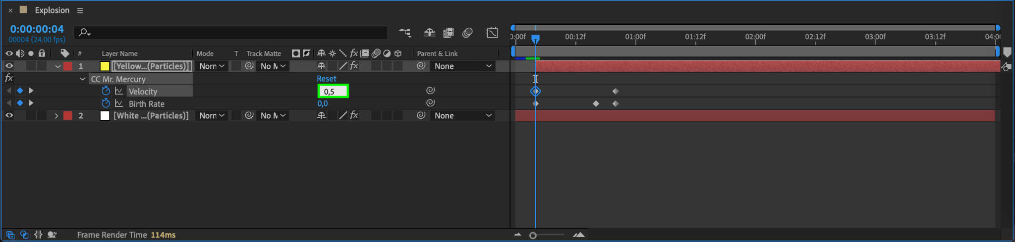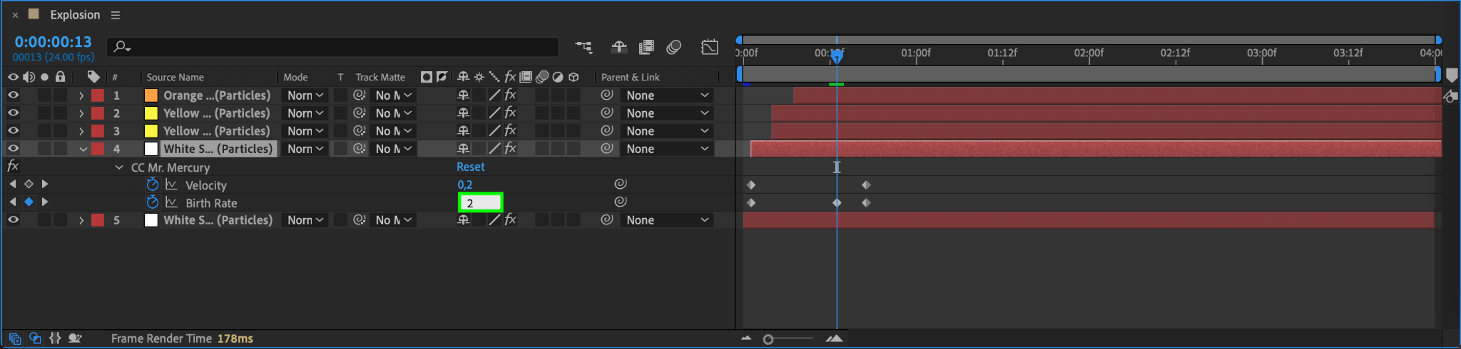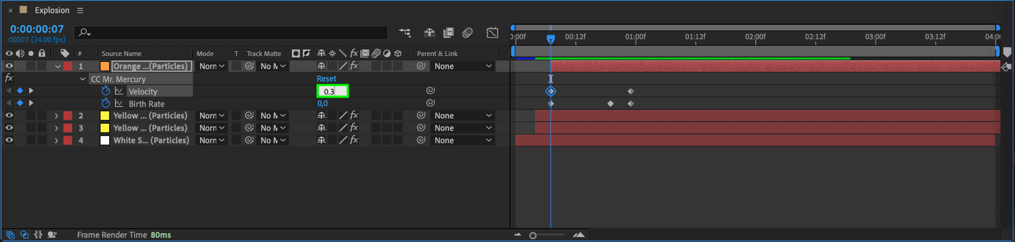 To animate the explosion, create keyframes for the Velocity and Birth Rate. Set the Birth Rate to 0 and Velocity to 1 at the start of the composition. Move the Current Time Indicator (CTI) forward, increase the Birth Rate to 50, then set both the Birth Rate and Velocity back to 0 after a few frames to simulate the explosion’s peak and fade.