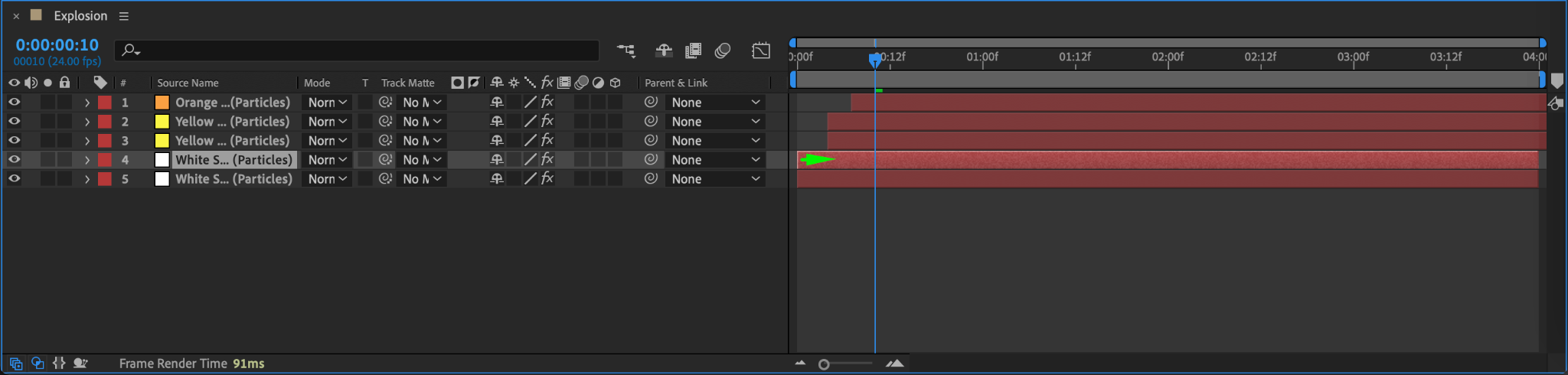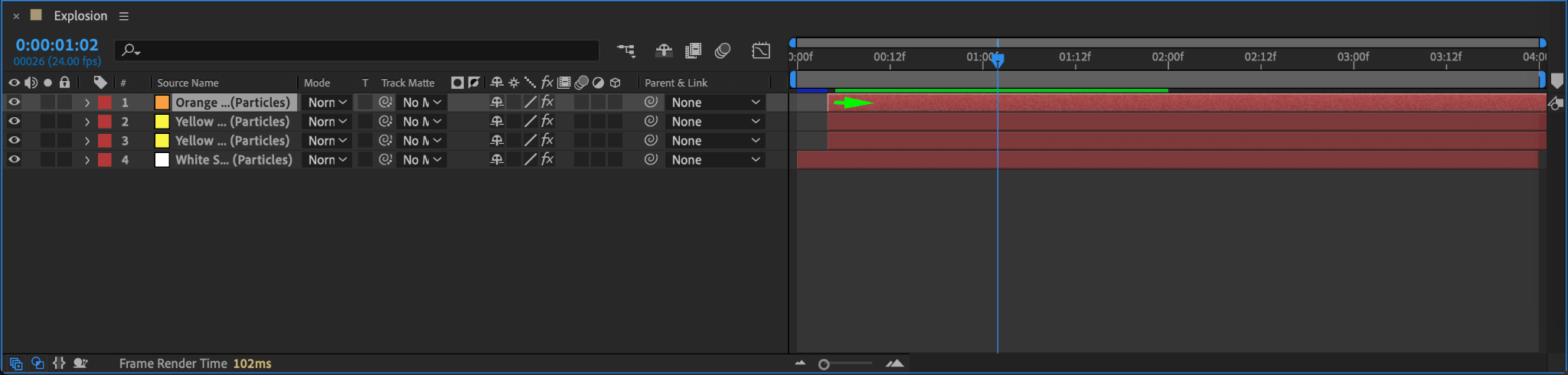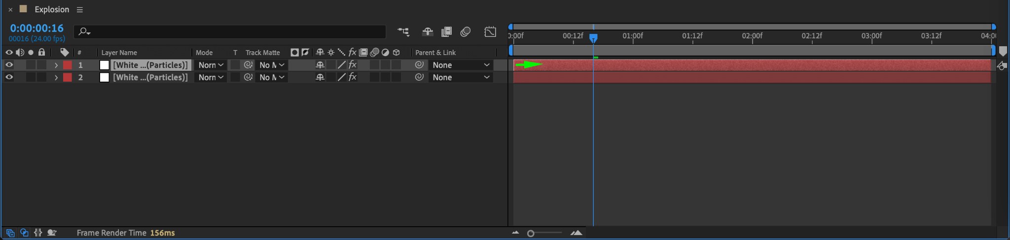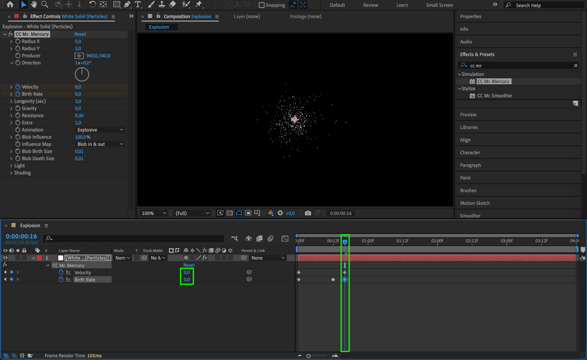 To animate the explosion, create keyframes for the Velocity and Birth Rate. Set the Birth Rate to 0 and Velocity to 1 at the start of the composition. Move the Current Time Indicator (CTI) forward, increase the Birth Rate to 50, then set both the Birth Rate and Velocity back to 0 after a few frames to simulate the explosion’s peak and fade.