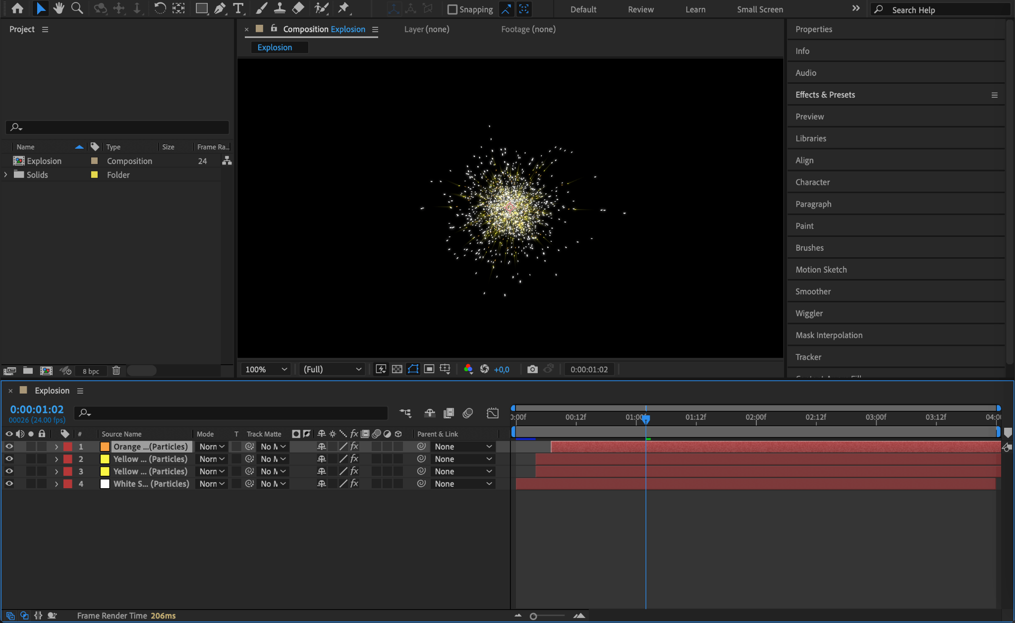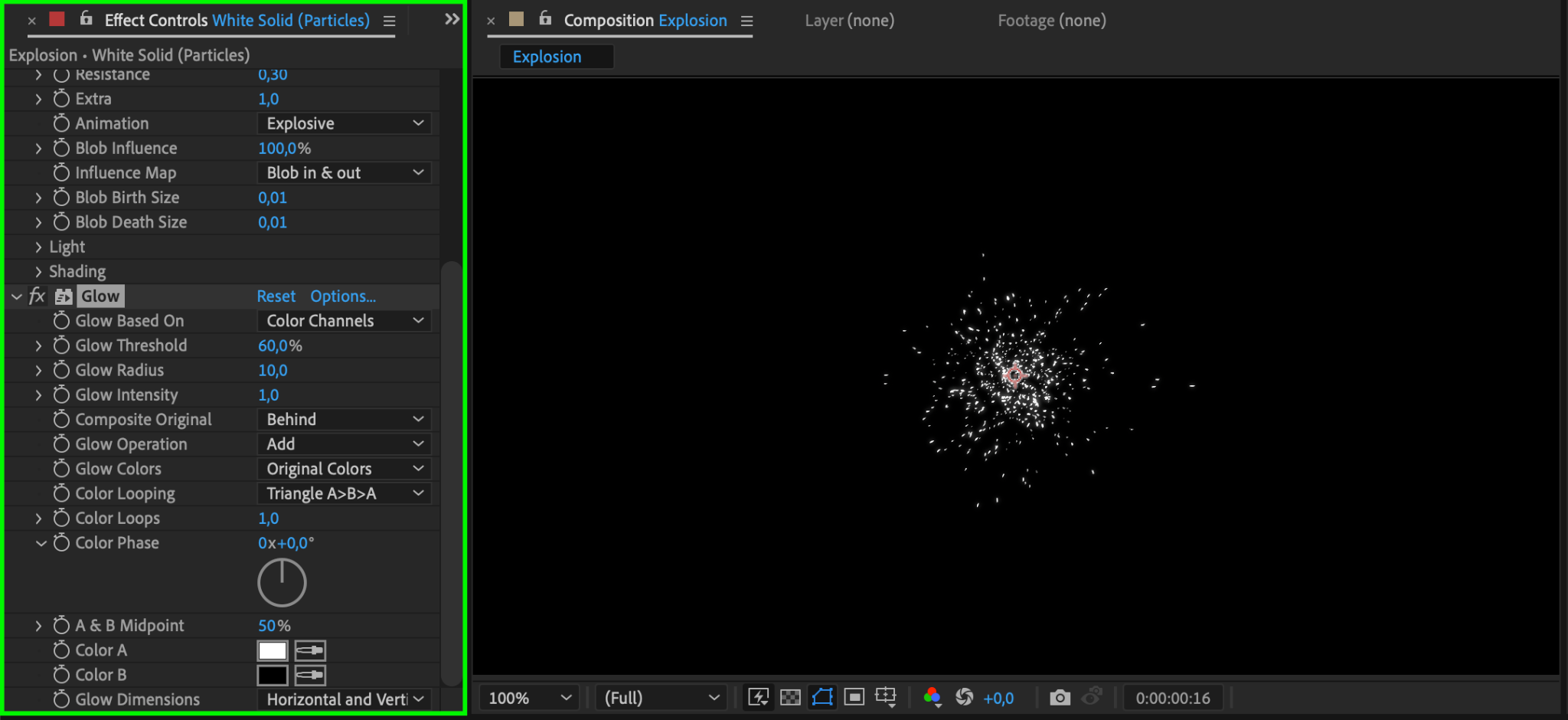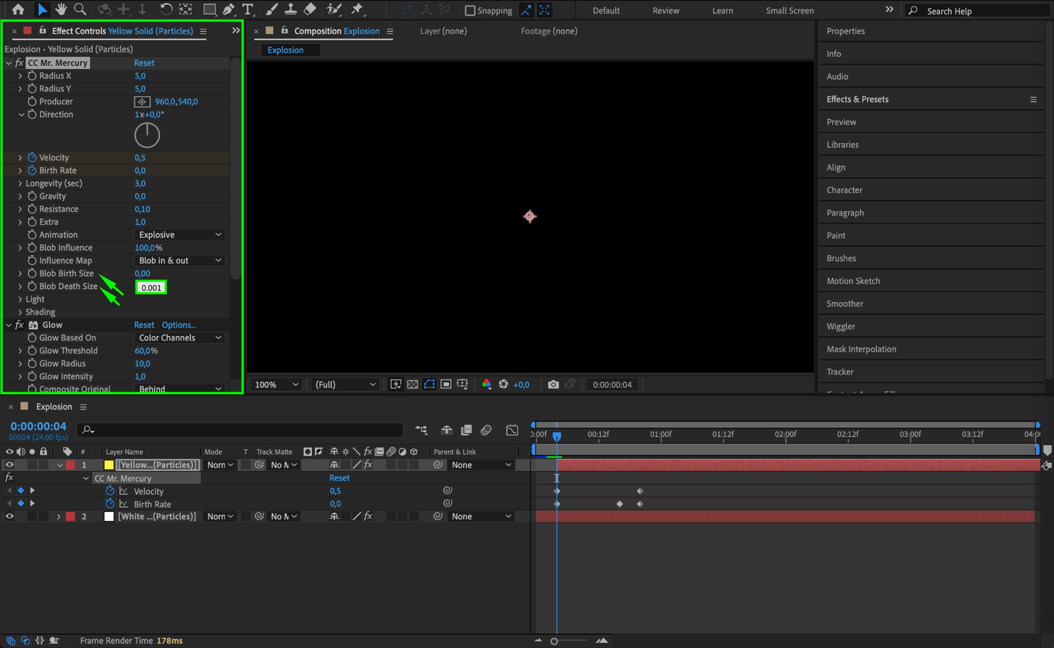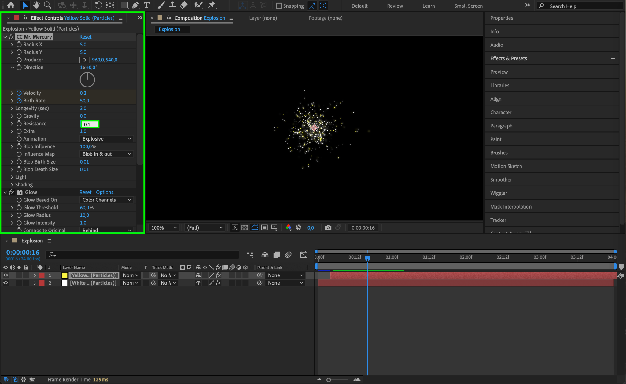 To enhance the brightness of the explosion, apply the Glow effect from the Effects & Presets panel to the solid layer.