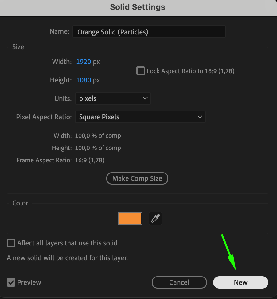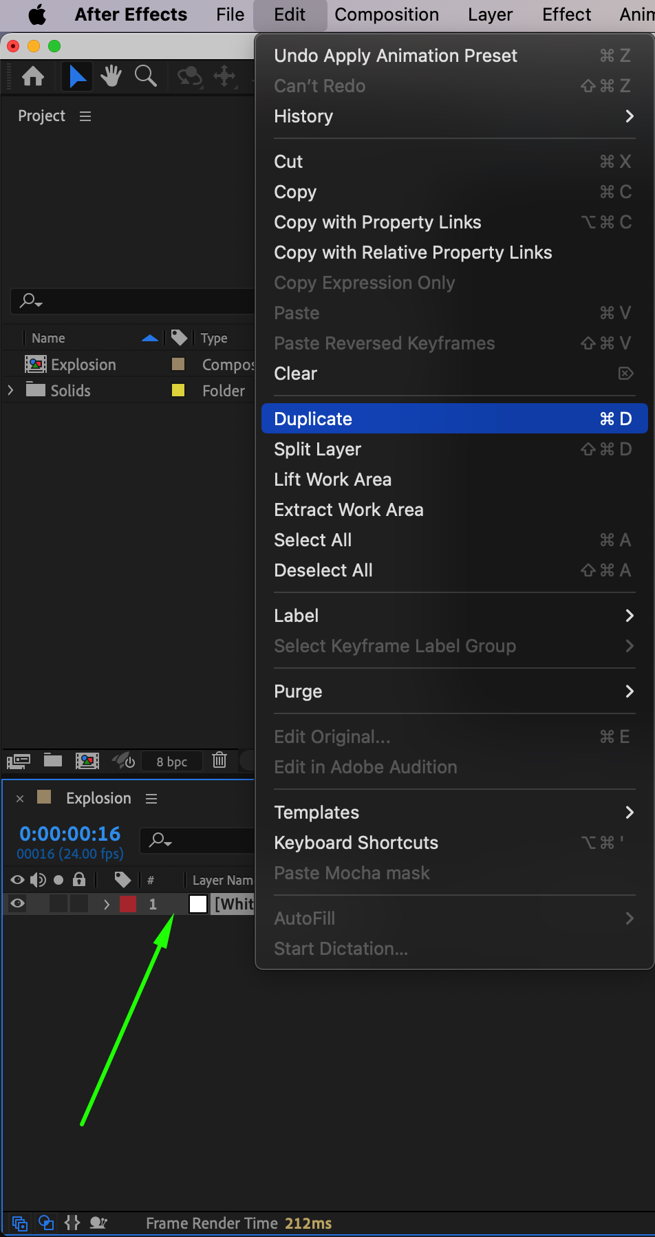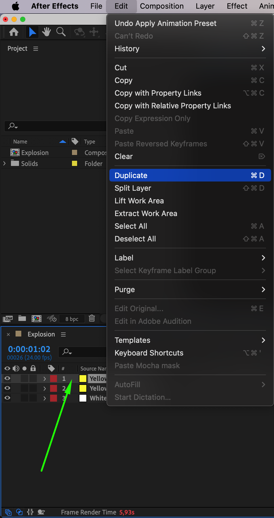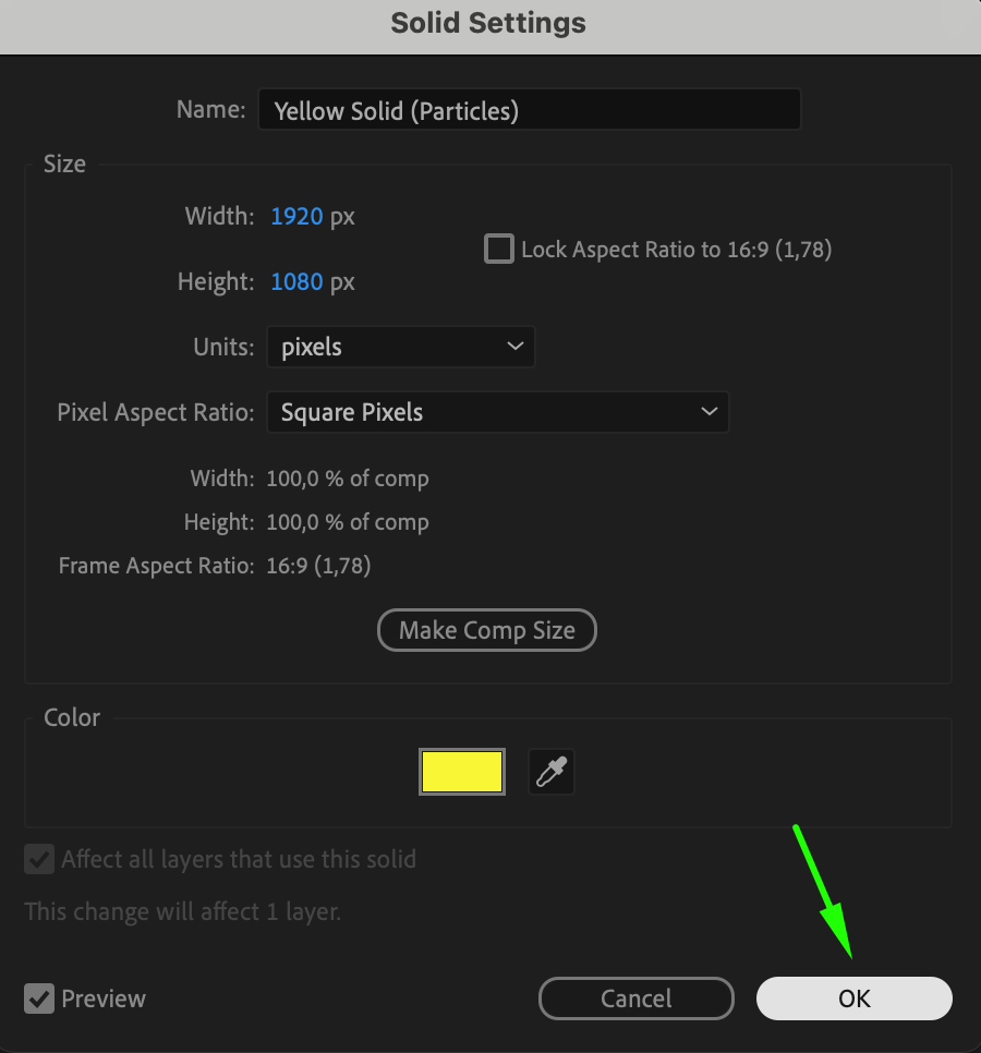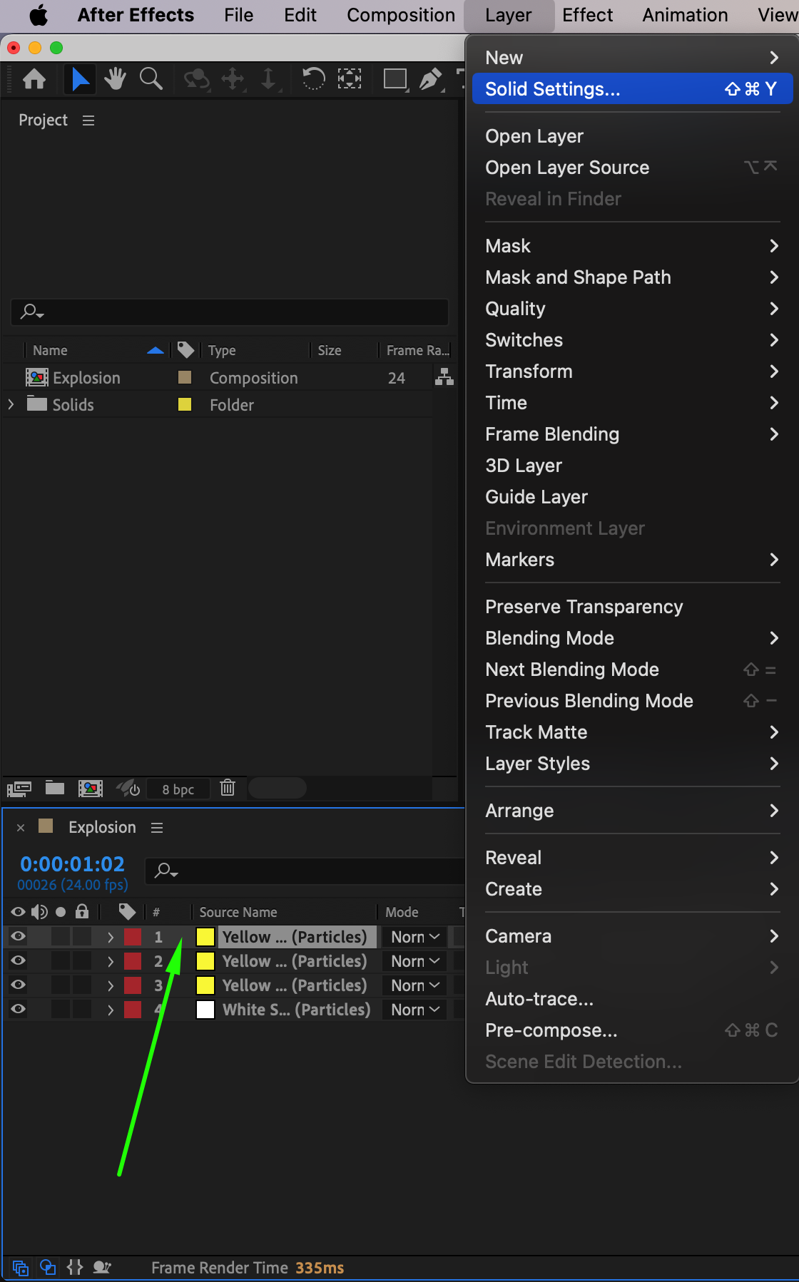 Duplicate the solid layer by pressing “Ctrl/Cmd + D”. Offset the duplicated layer by a few frames in the timeline. Change the duplicate’s color by going to Layer > Solid Settings and rename it to Yellow Solid.