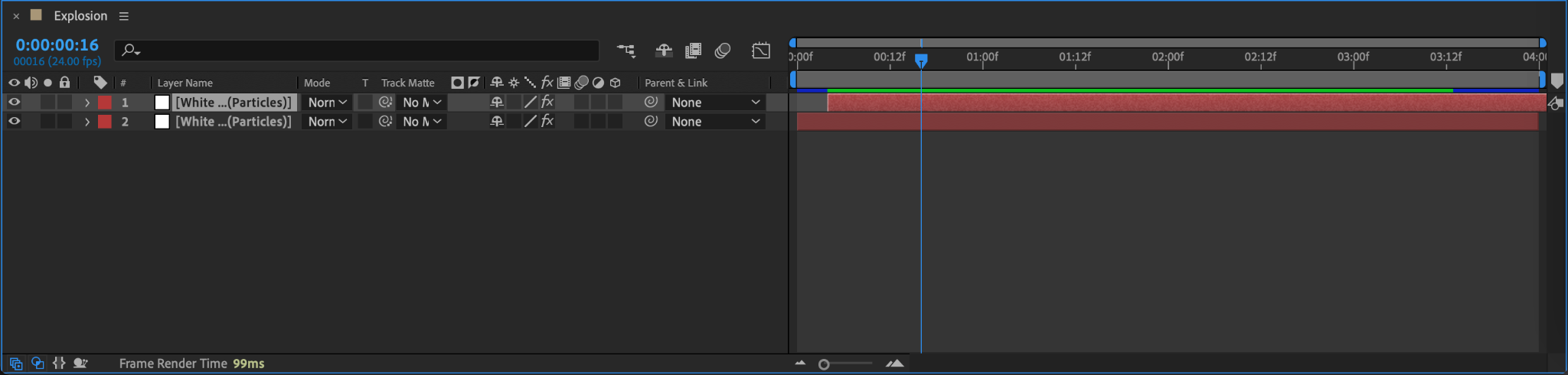 Duplicate the original white solid and move it forward in the timeline. Adjust the Birth Rate to 2 and Velocity to 3 at their respective keyframes for variation in the explosion effect.