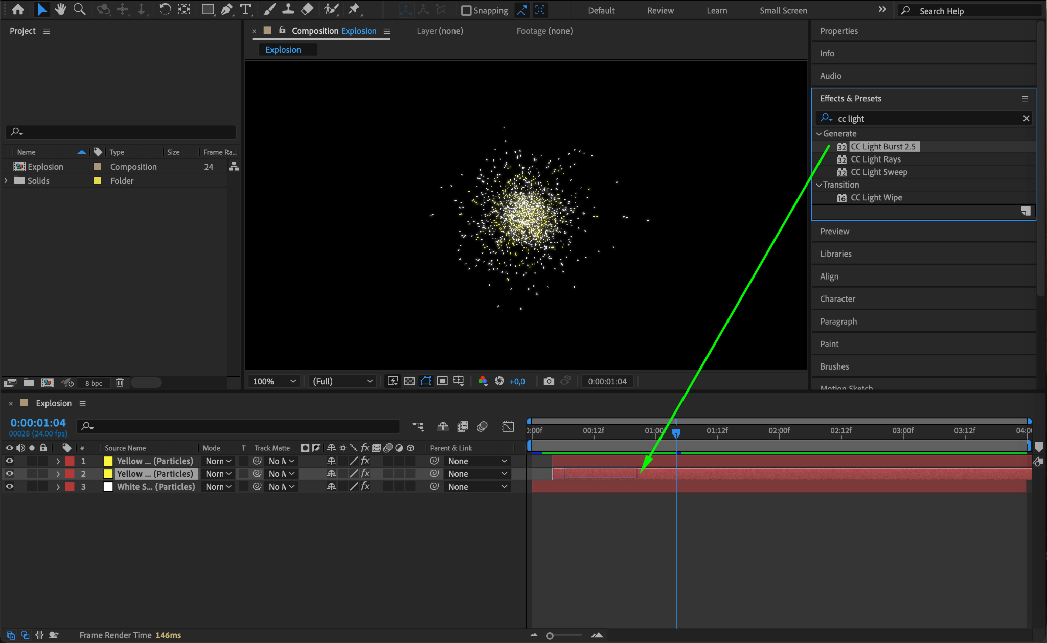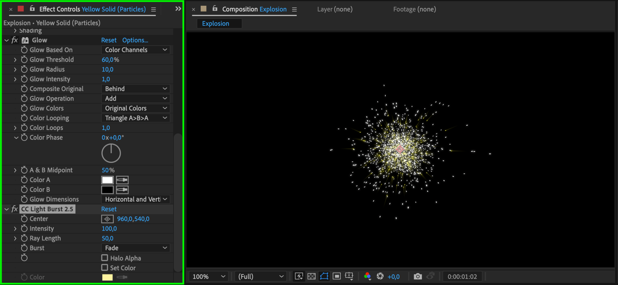 Duplicate the Yellow solid layer by pressing “Ctrl/Cmd + D”. Apply the CC Light Burst 2.5 effect to the original yellow solid layer to create a glowing burst of light.
