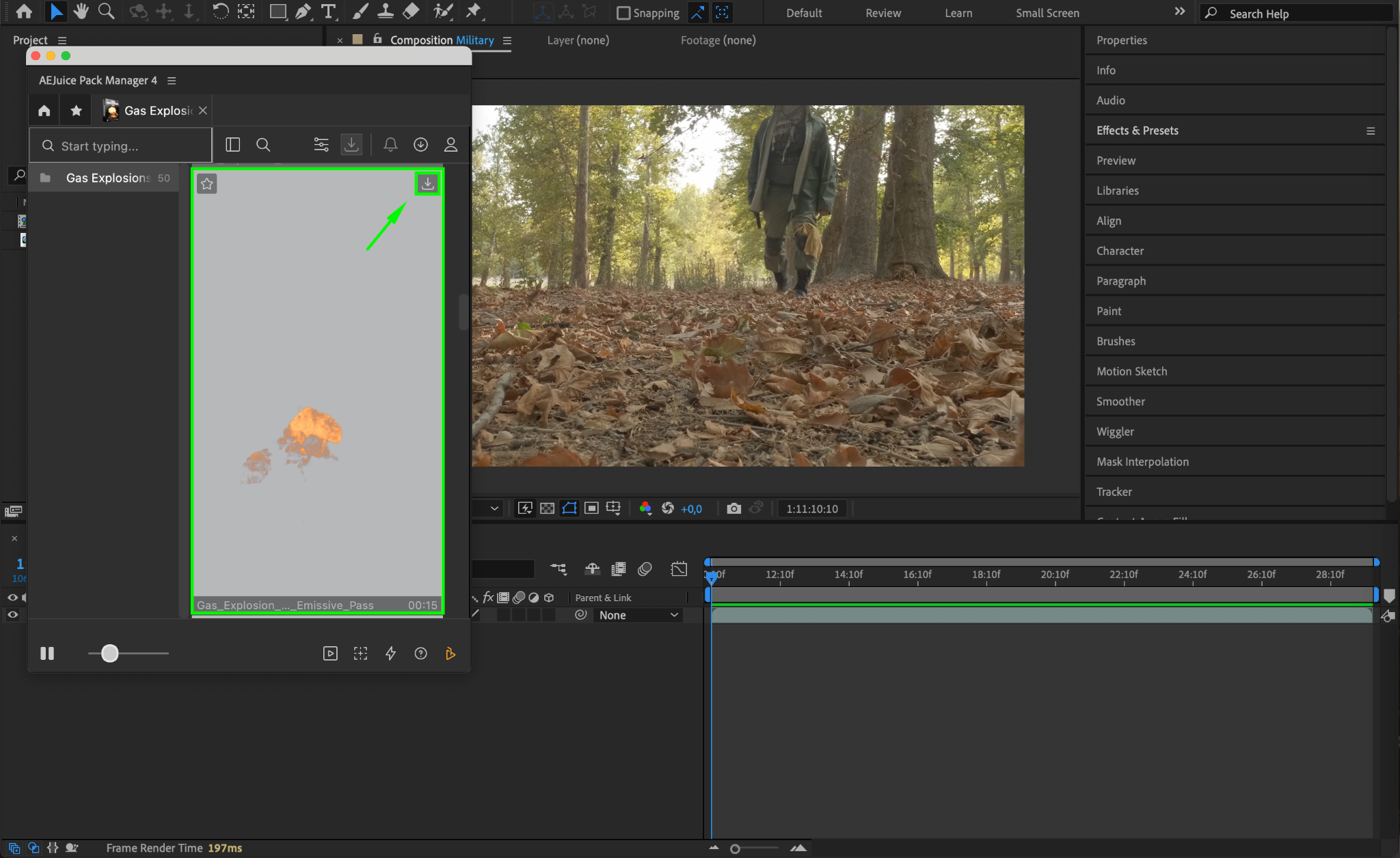 If you prefer a faster method with pre-made effects, you can use third-party plugins such as AEJuice Pack Manager to add explosions.