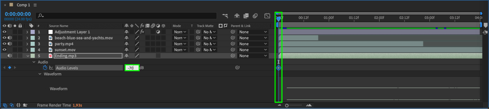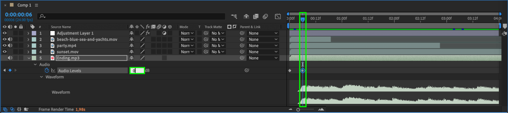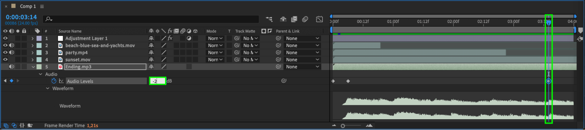 Great visuals need great sound to create an immersive experience. Import your soundtrack or sound effects and add them to the timeline. Use After Effects to synchronize audio with your video clips, and edit audio levels by pressing “L” to adjust the volume or “LL” to visualize the audio waveform. For dynamic audio effects, animate the Audio Levels property to fade in/out or boost specific sounds.