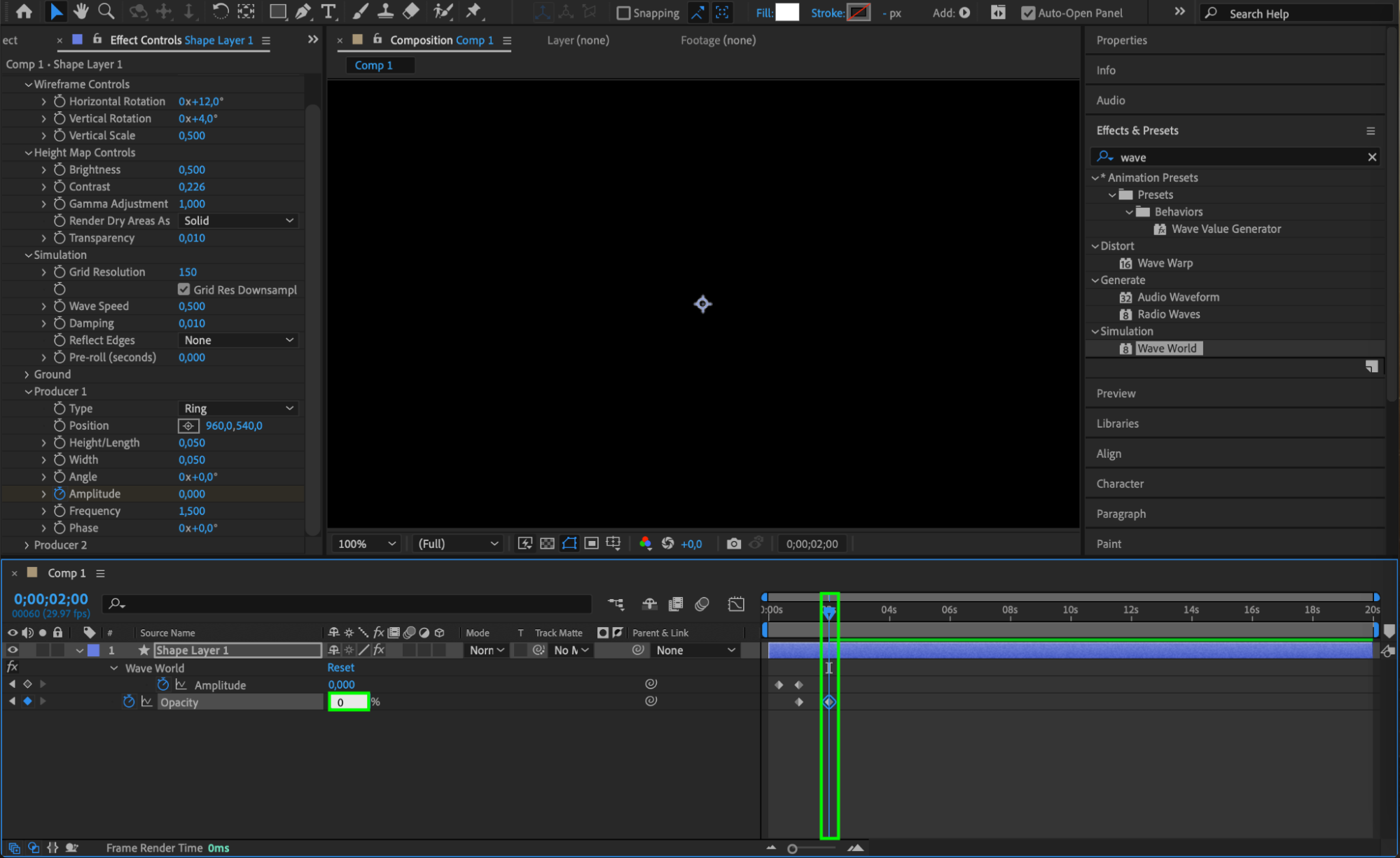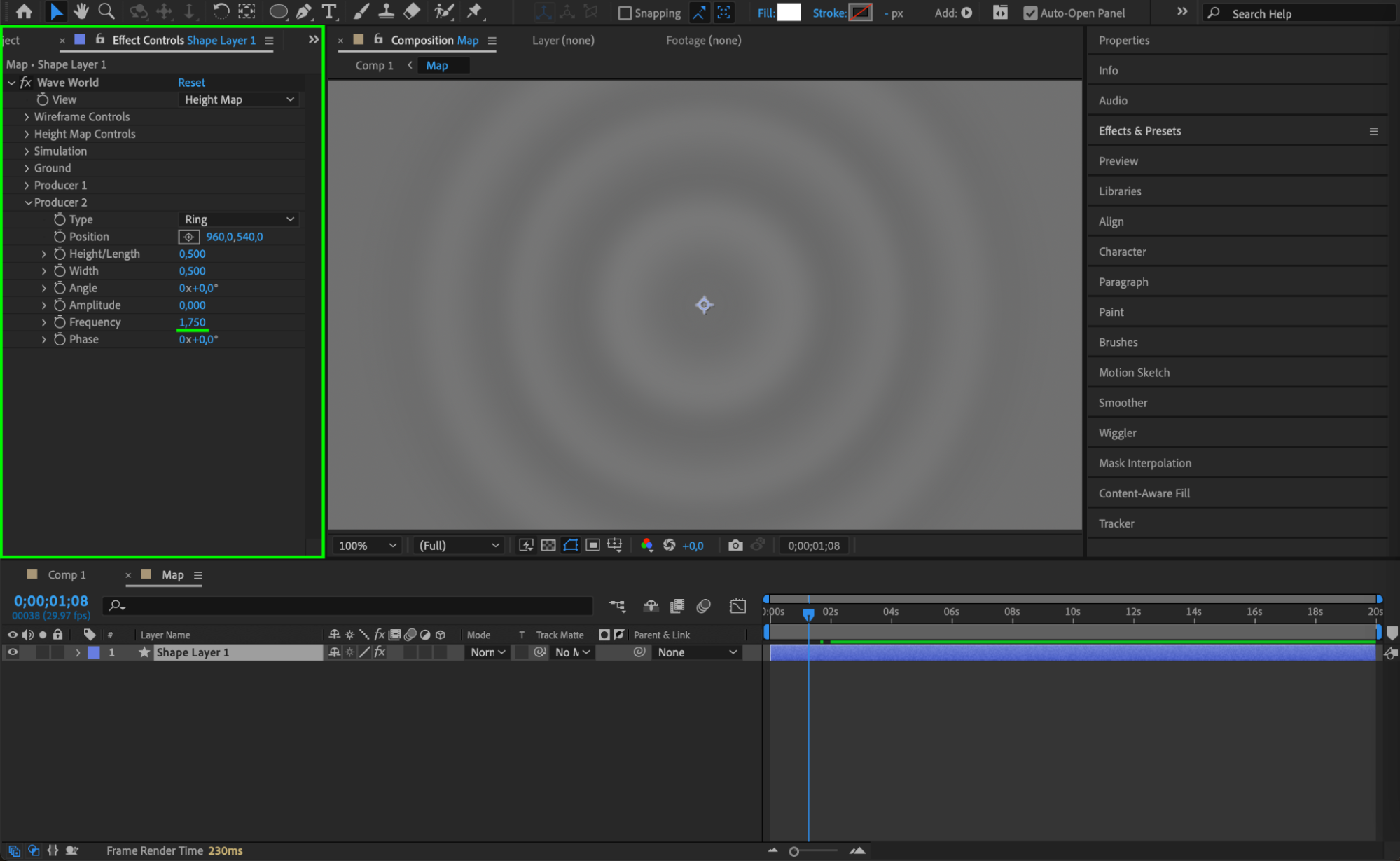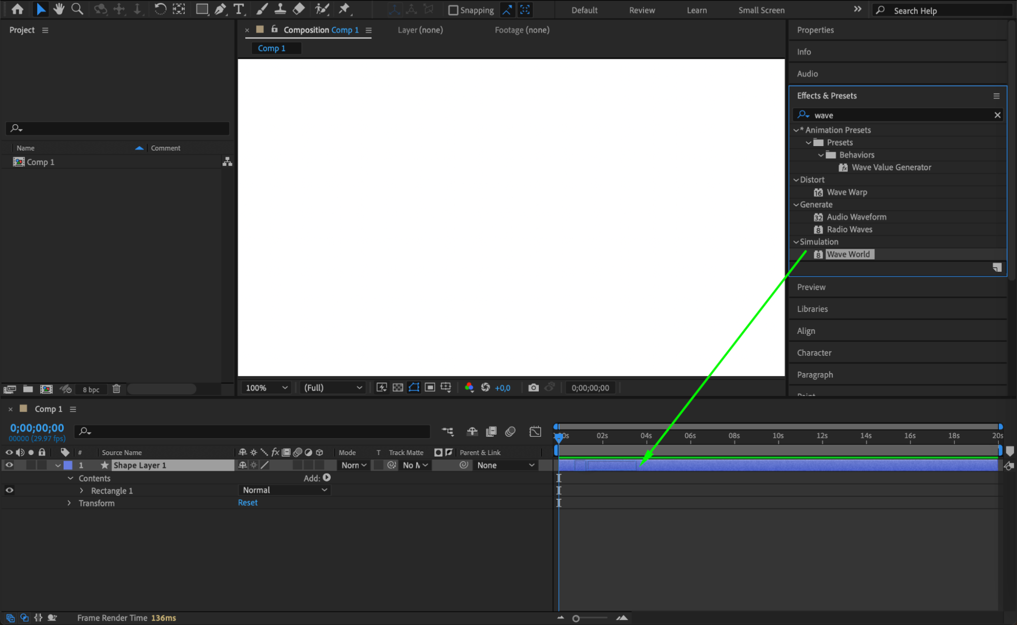 Apply the Wave World effect to your shape layer by dragging it from the Effects & Presets panel.