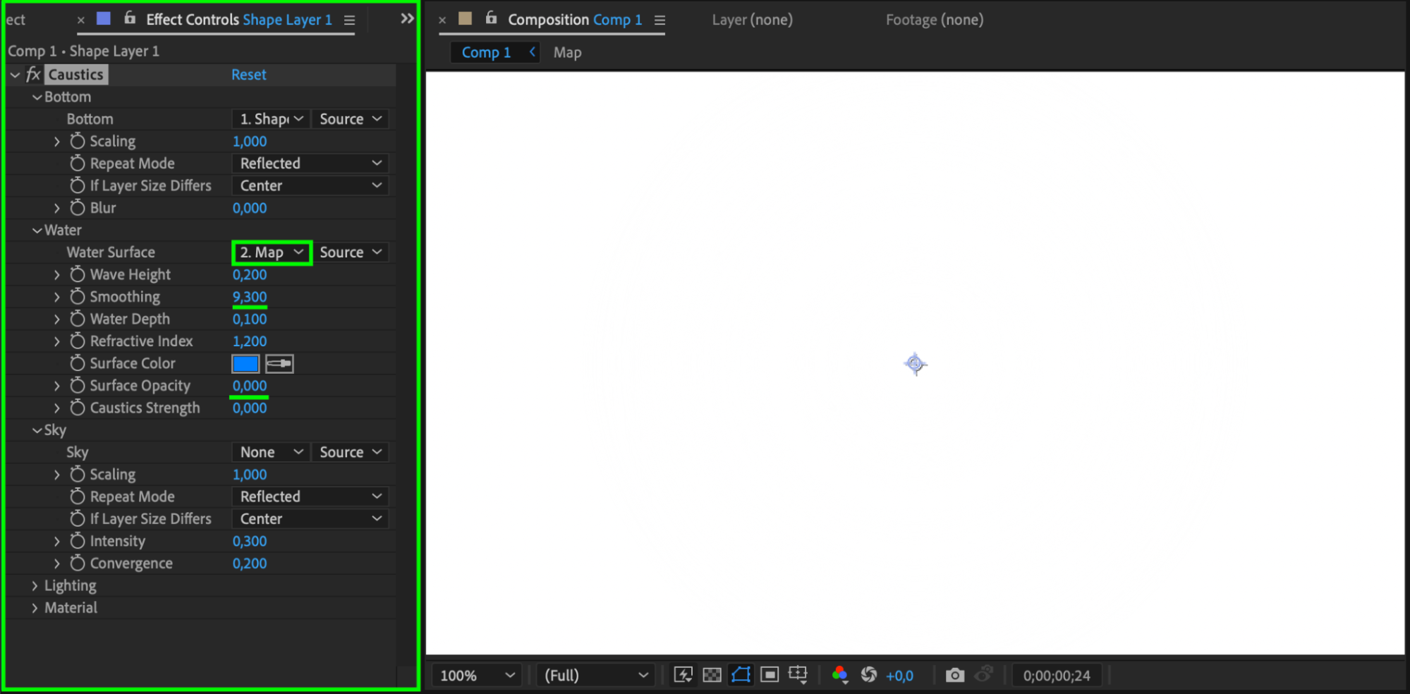 In the Effect Controls panel, set the following parameters for the Caustics effect: