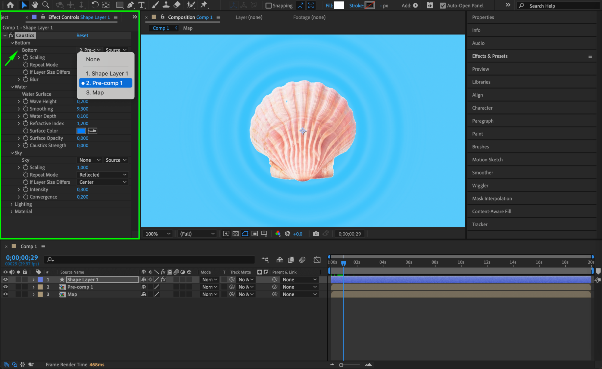 Place the pre-comp at the top of the timeline and apply the Caustics effect from the Effects & Presets panel.