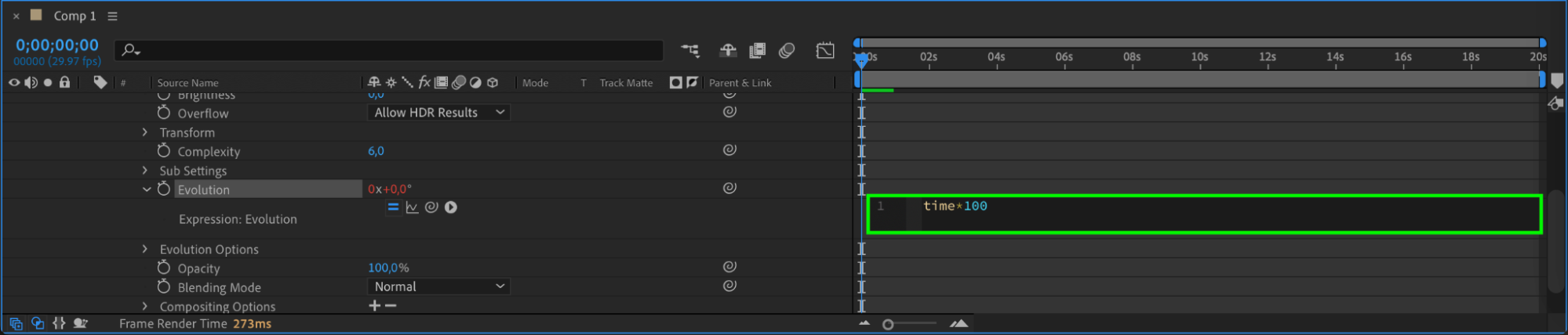 Animate the Amplitude parameter by moving the CTI (Current Time Indicator) 10 frames forward from the start of the composition (Ctrl/Cmd + Shift + Right Arrow) and setting the value to 0.4. Move the CTI another 20 frames forward and set the value to 0.