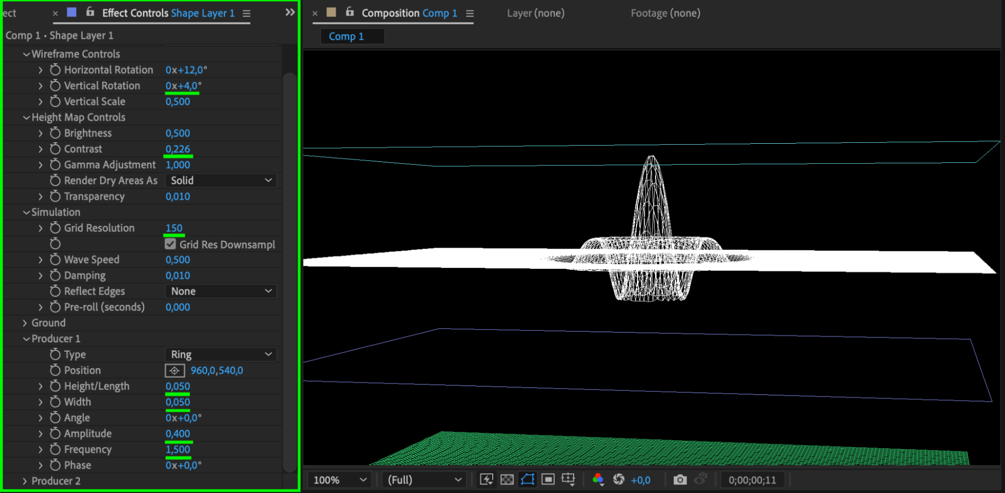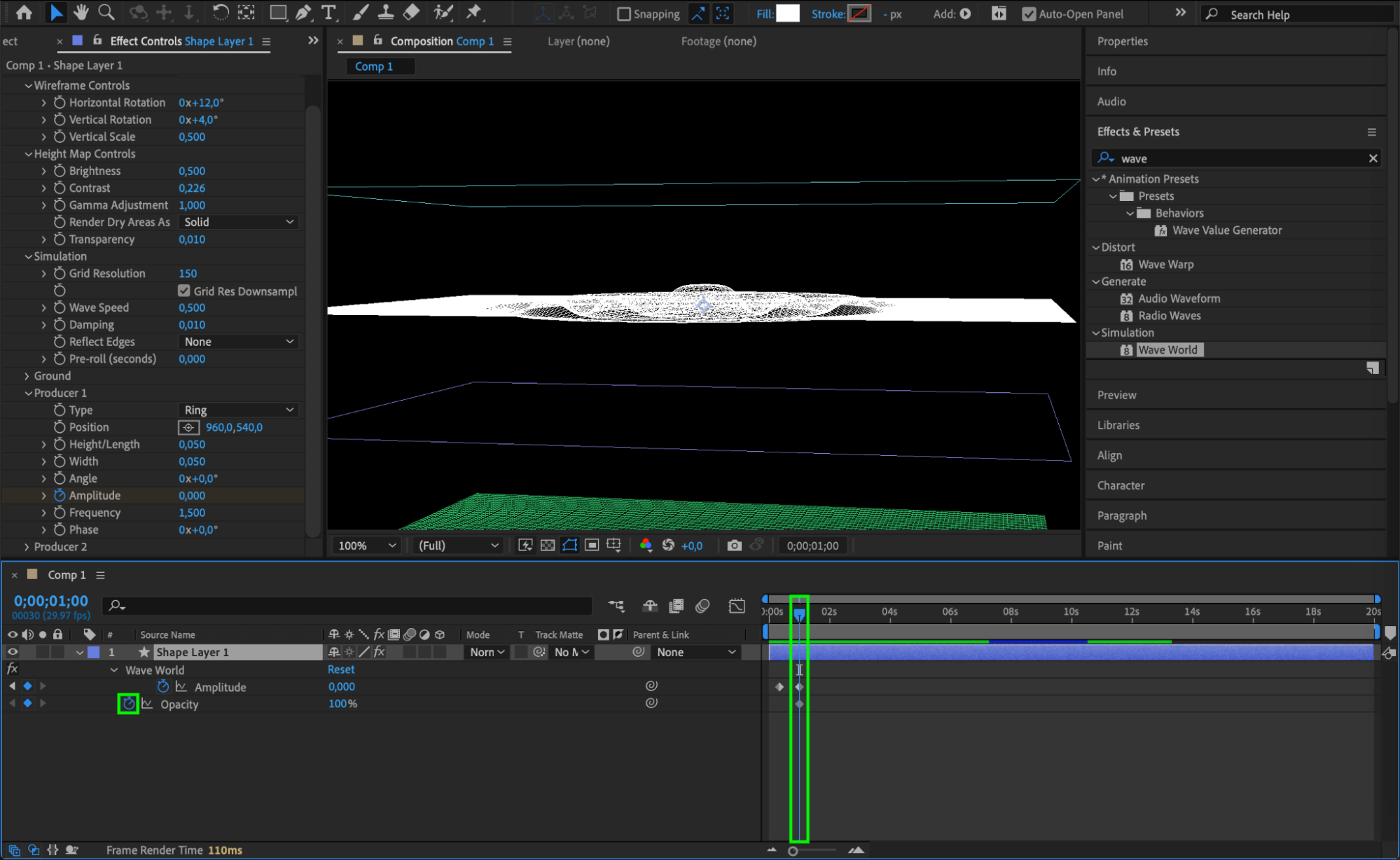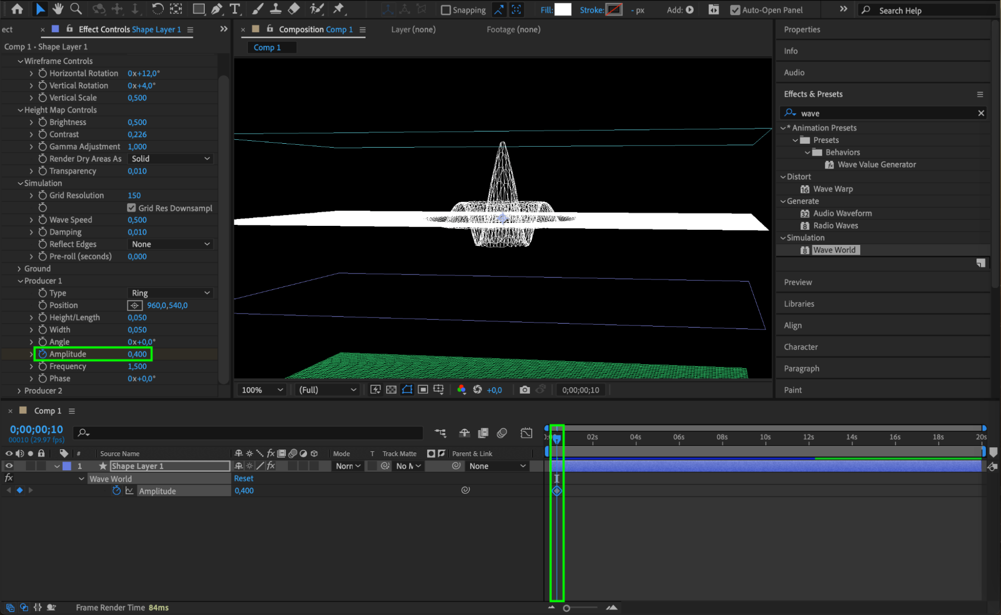 Animate the Amplitude parameter by moving the CTI (Current Time Indicator) 10 frames forward from the start of the composition (Ctrl/Cmd + Shift + Right Arrow) and setting the value to 0.4. Move the CTI another 20 frames forward and set the value to 0.