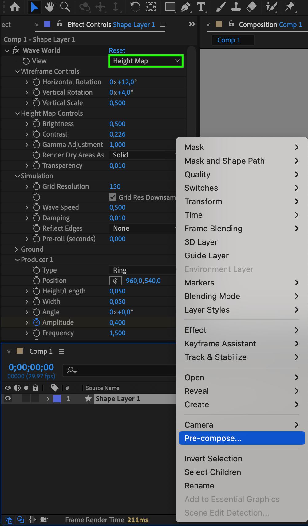 In the Effect Controls panel, set the View to Height Map. Right-click on your layer and select Pre-compose from the submenu. Name this pre-comp “Map.”