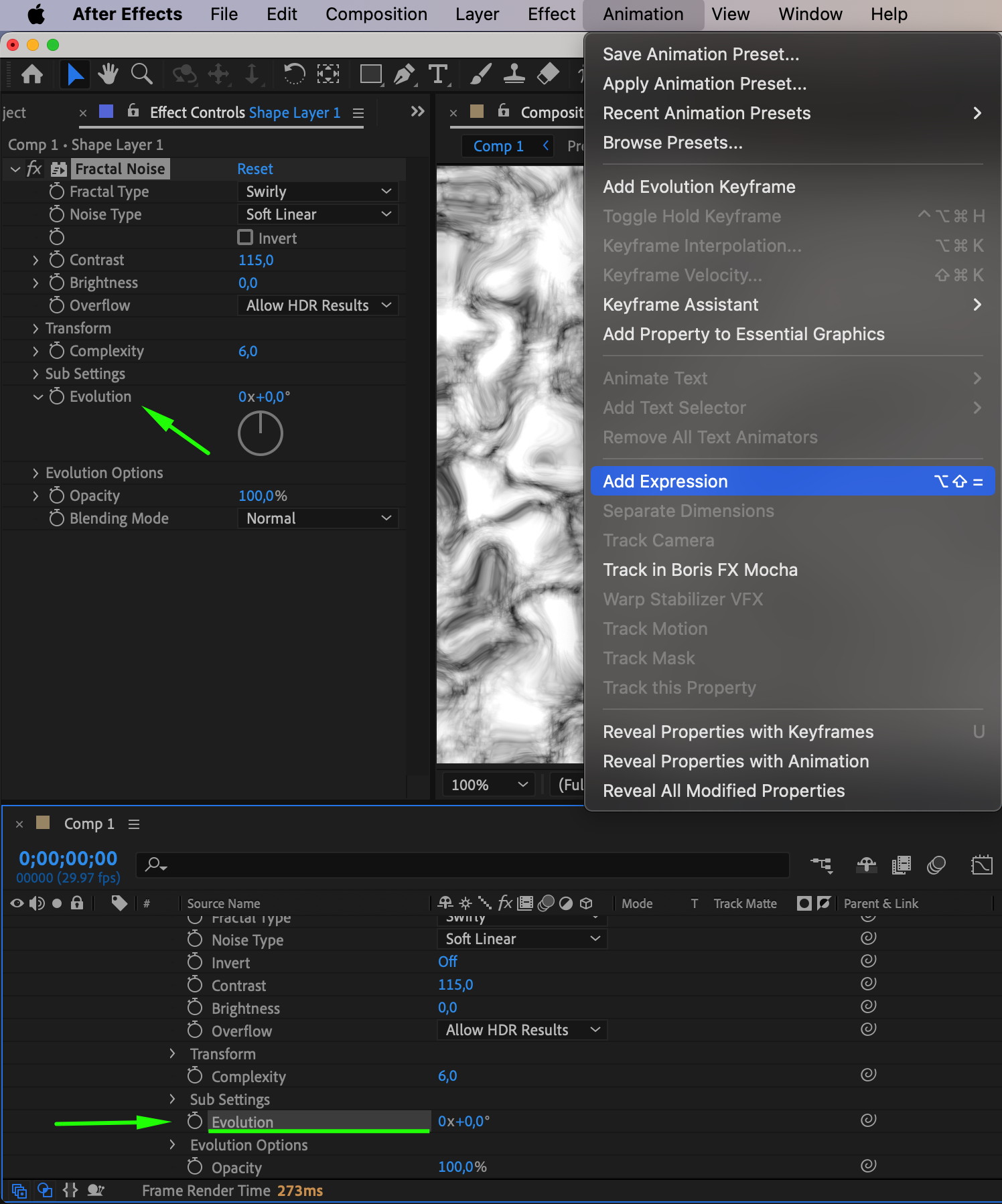 Apply the expression time*100 to the Evolution parameter to animate the noise over time.