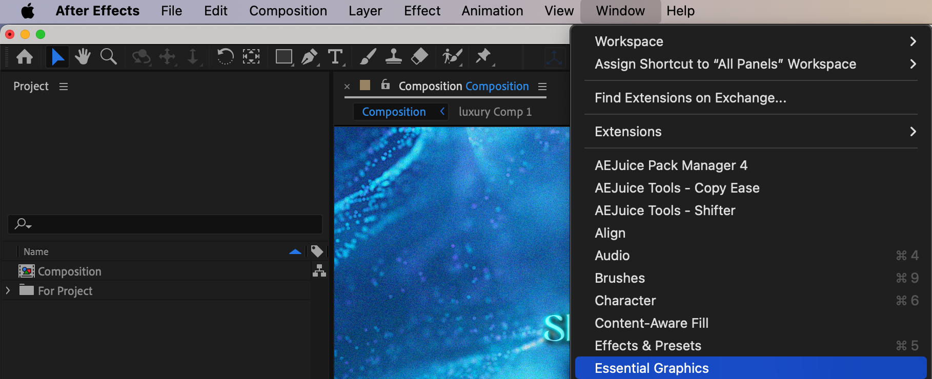 Once your design is complete, you’ll need to open the Essential Graphics panel to set up the customizations. Go to Window > Essential Graphics. This panel allows you to select and define the elements of your composition that you want to make editable in Premiere Pro, such as text fields, colors, or slider controls.