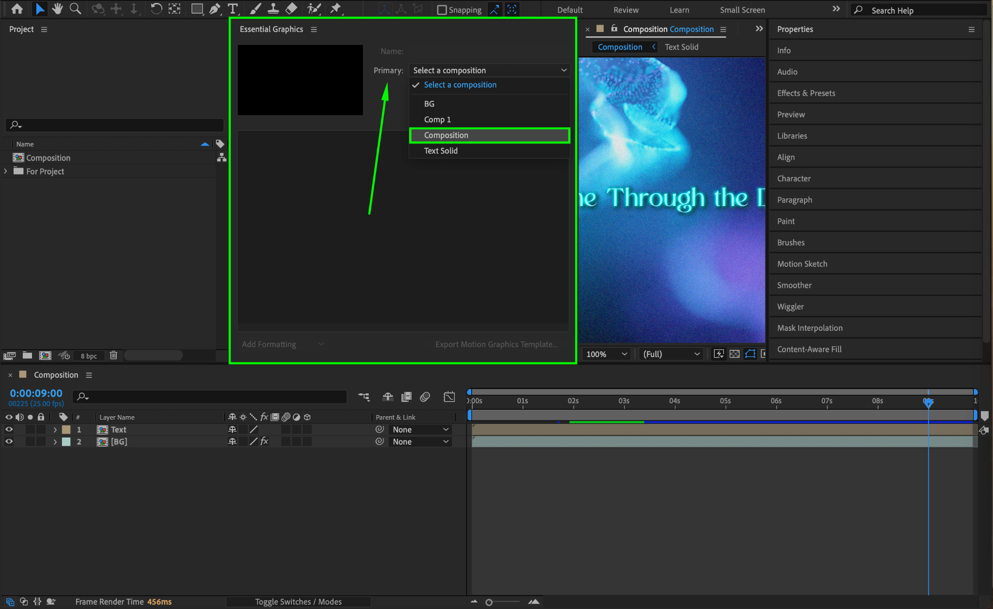 In the Essential Graphics panel, you’ll see an option to choose a primary composition. Select your main composition, the one containing the graphics and animations you wish to include in the MOGRT file. This will serve as the main template for your motion graphic in Premiere Pro.