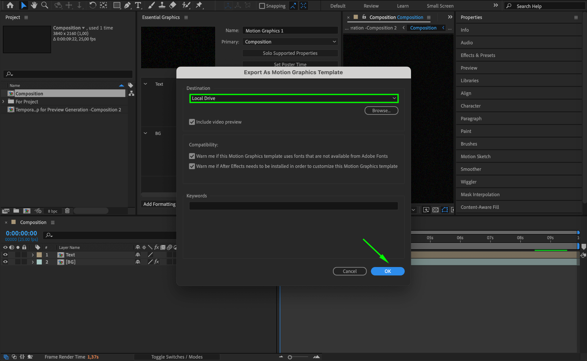 In the export window, you’ll be given options to save your MOGRT file either to your local drive or directly to your Creative Cloud library, allowing easy access from Premiere Pro. Choose your preferred destination and click OK to begin the export process.