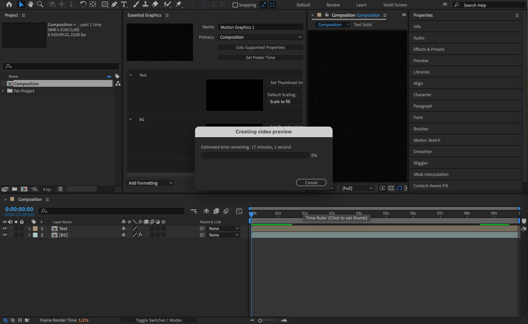 After clicking OK, After Effects will begin creating a preview for the MOGRT file, followed by exporting the file itself. The time this takes depends on the complexity of your composition. Once completed, the MOGRT file will be available for use in Premiere Pro.