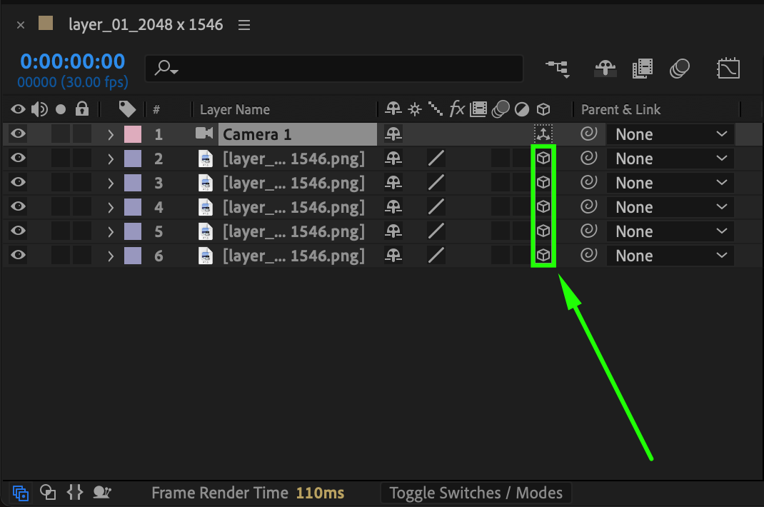 Enable 3D for all layers by clicking the 3D cube icon in the timeline. This allows you to move layers along the Z-axis, adding depth to your scene.