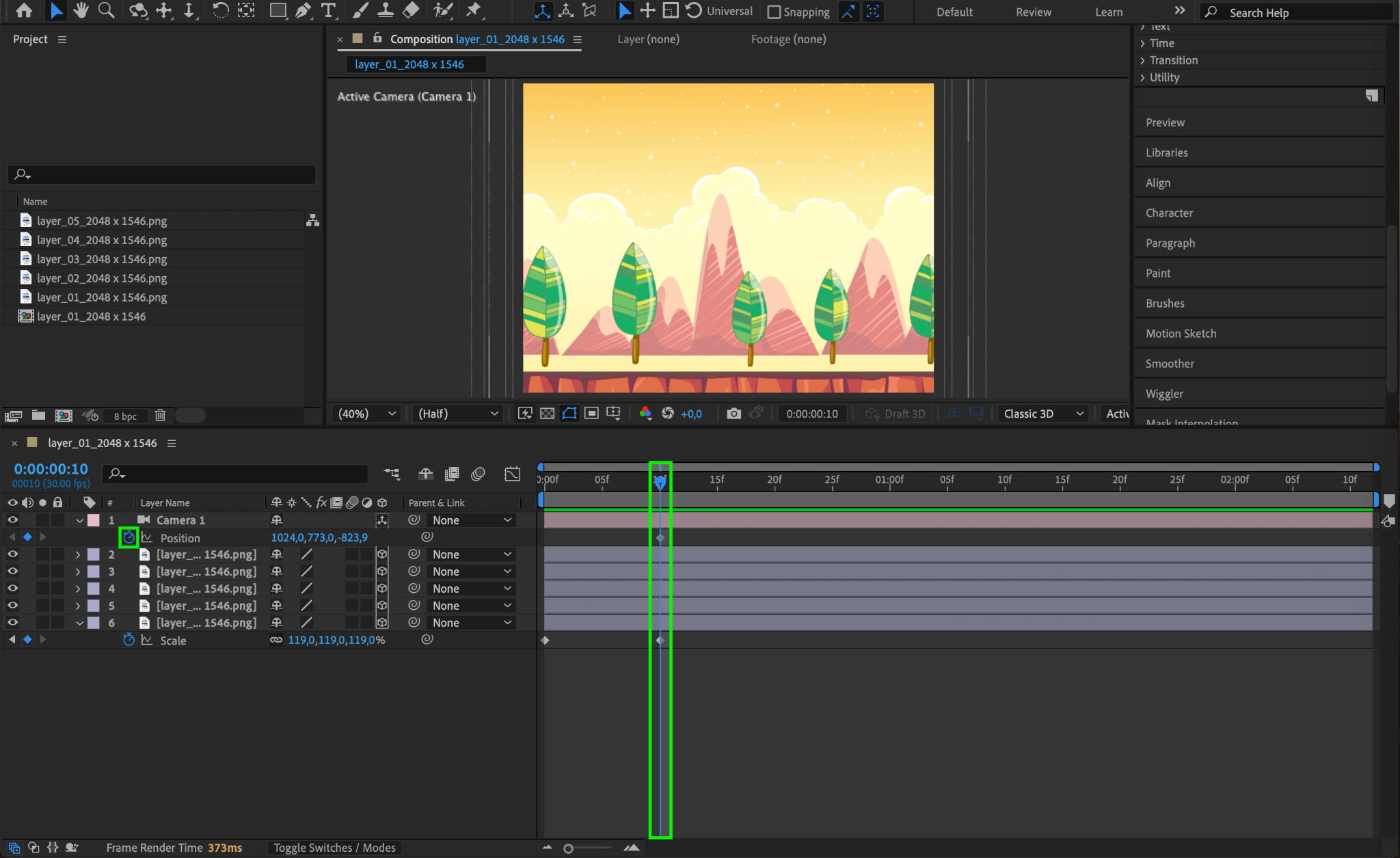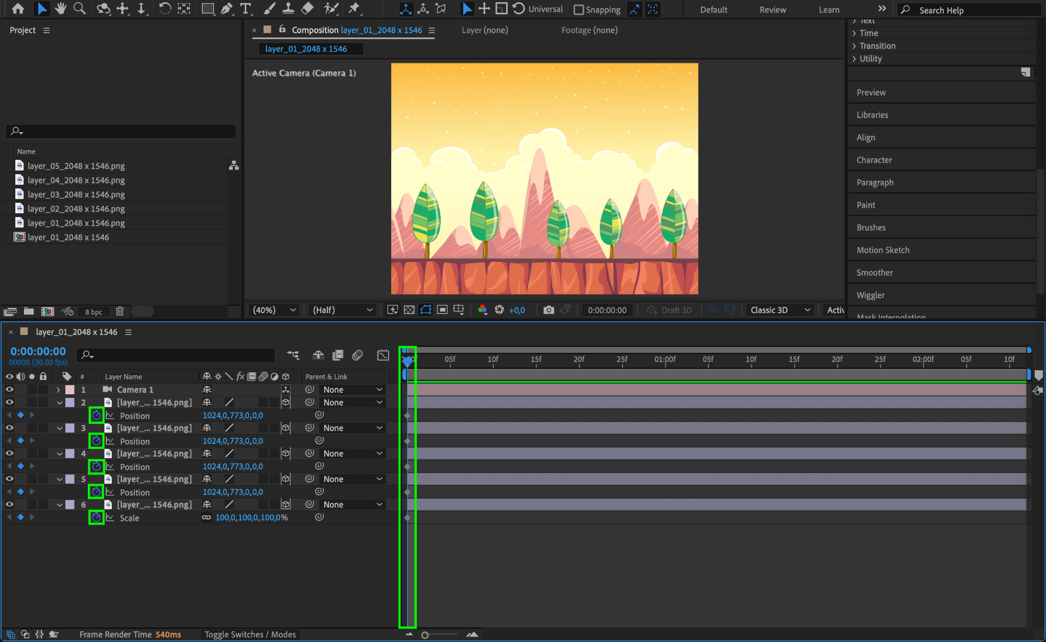 For all layers except the background, press “P” to reveal their position settings and click the stopwatch icon to set keyframes. For the background layer, press “S” to adjust the scale, ensuring it fits the composition throughout the animation. These animations will help build the layered motion.