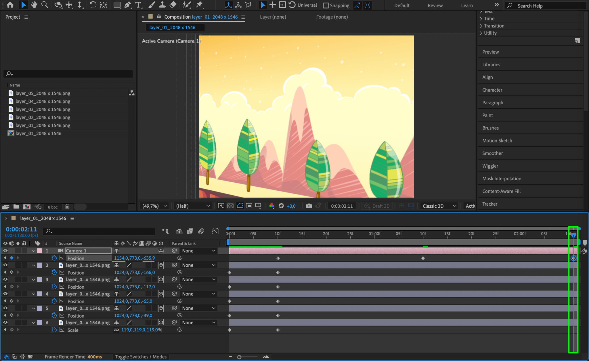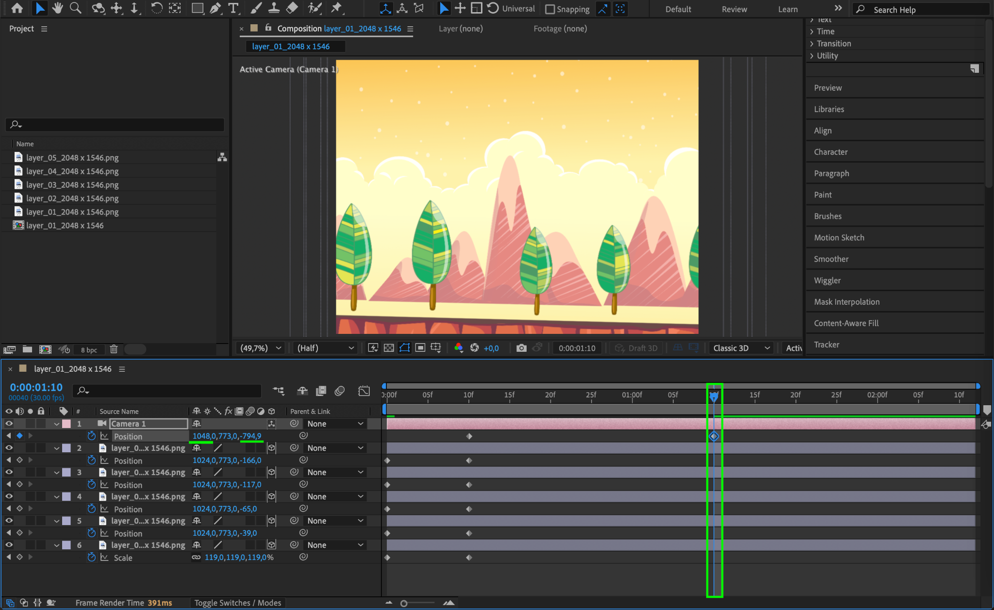 Repeat this process for all layers, assigning larger negative Z-axis values to closer layers and smaller negative values to more distant ones. This positioning creates a realistic parallax effect by ensuring that foreground layers move faster than the background layers during animation.