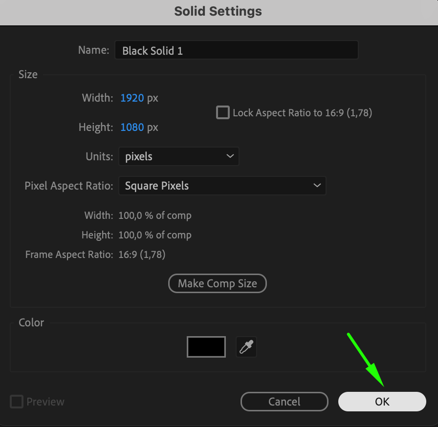 Go to Layer > New > Solid to create a new solid layer. Choose a background color that complements your video and sets the right tone for your credits. This will serve as the base layer for your end credits.