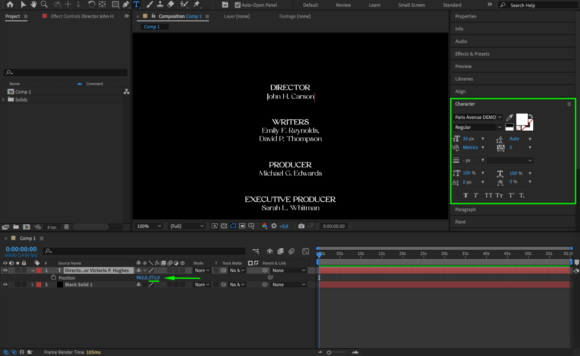 Select the Type Tool (Ctrl/Cmd + T) and click on the center of your composition to start typing. Enter the roles or professions (e.g., Director, Producer) that you want to include in your credits. Use Ctrl/Cmd + V to paste text if you have pre-written content.