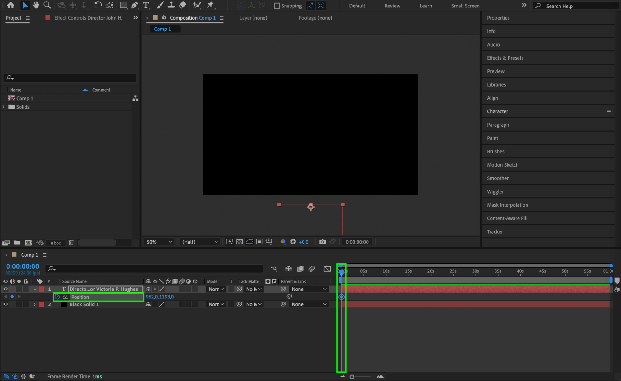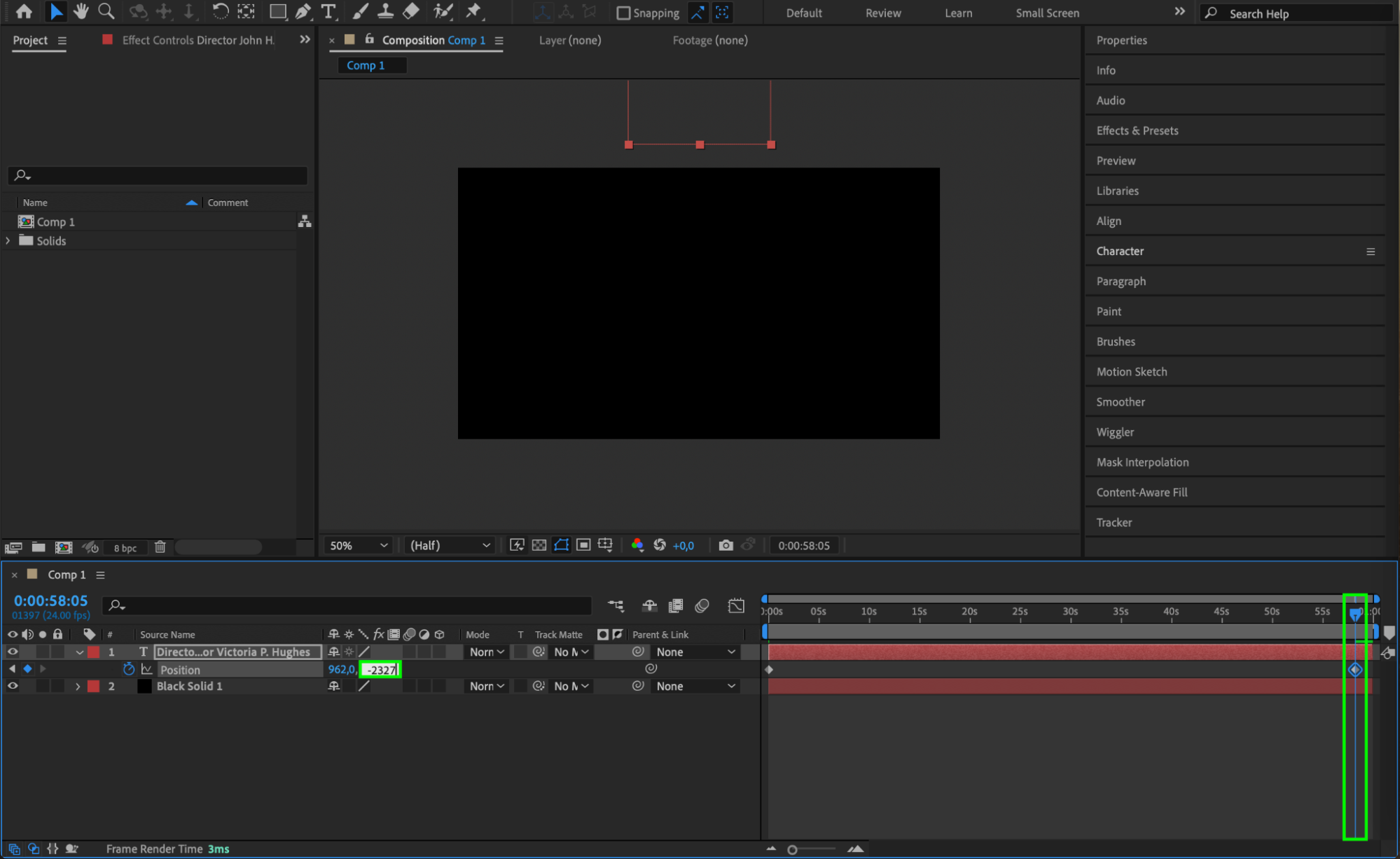 Use the Character panel to adjust the font, size, and style of your text to match the look you want for your credits. The Align panel will help you center the text and position it correctly within the composition.