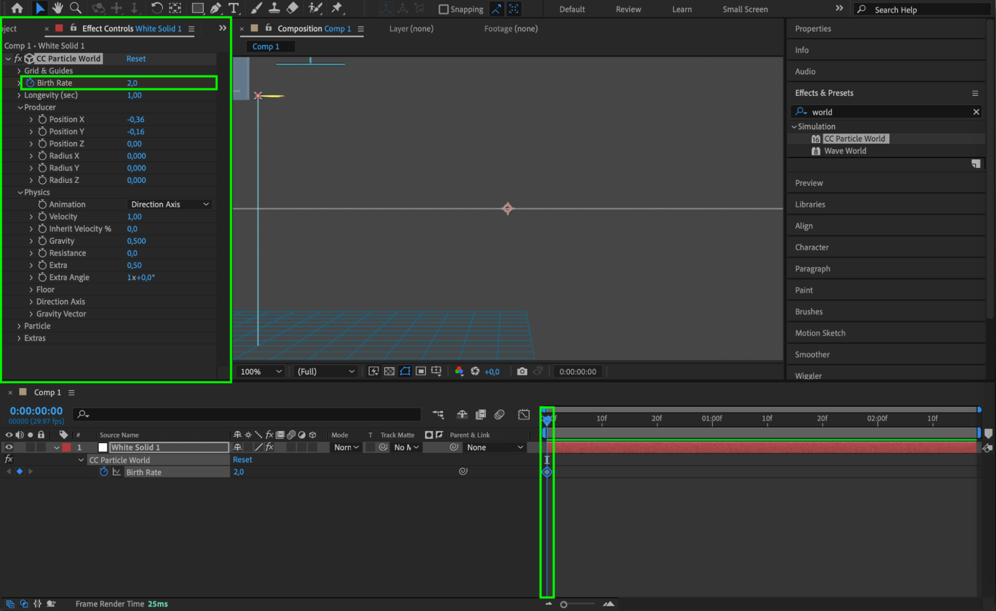 Animate the Birth Rate parameter by clicking the stopwatch icon to set keyframes. Start with a value of 2 at the beginning of the composition, and then reduce it to 0 one frame forward to simulate the initial burst of the splatter.