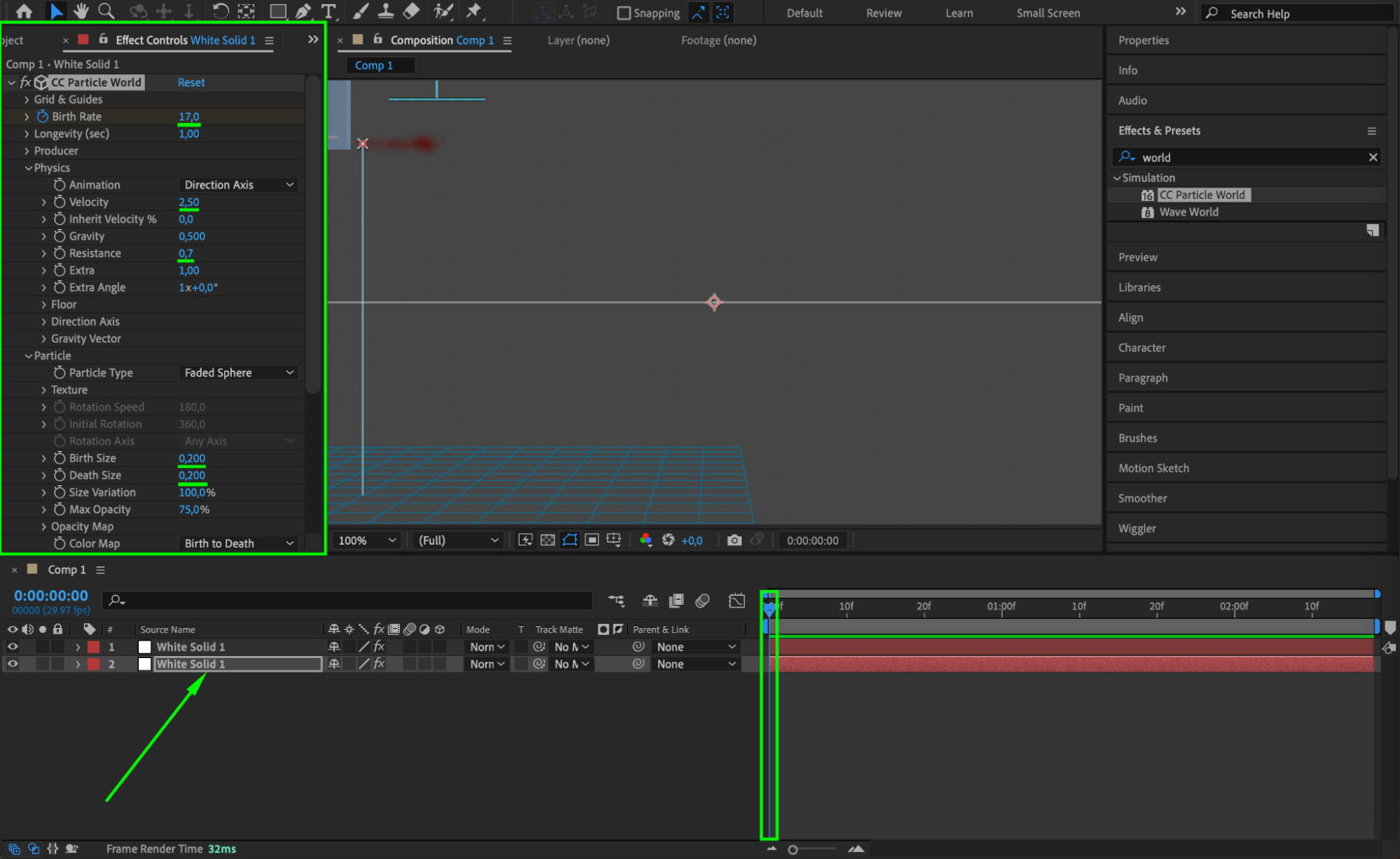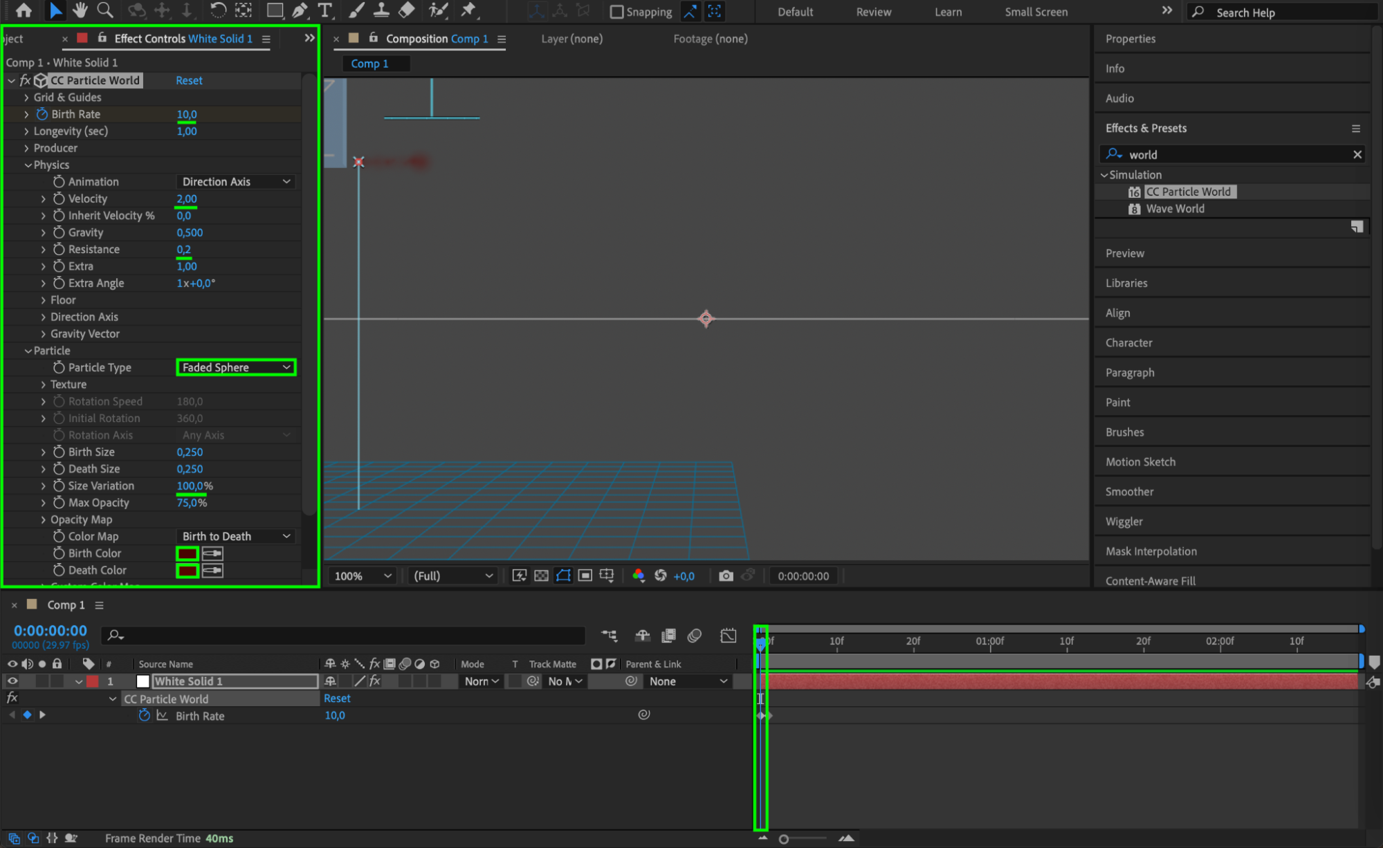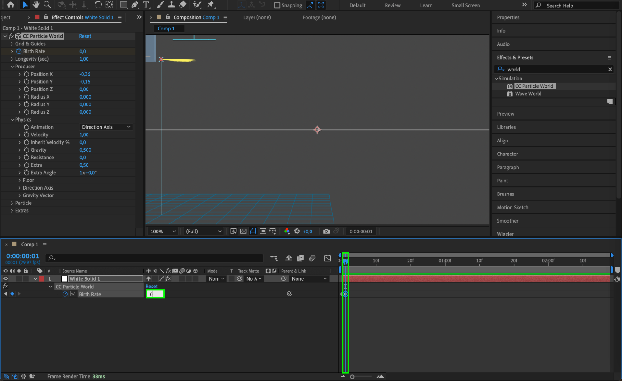 With your solid layer selected, go to “Effect” > “Simulation” > “CC Particle World.” This effect will allow you to generate and animate particles that will mimic the appearance of blood splatter.