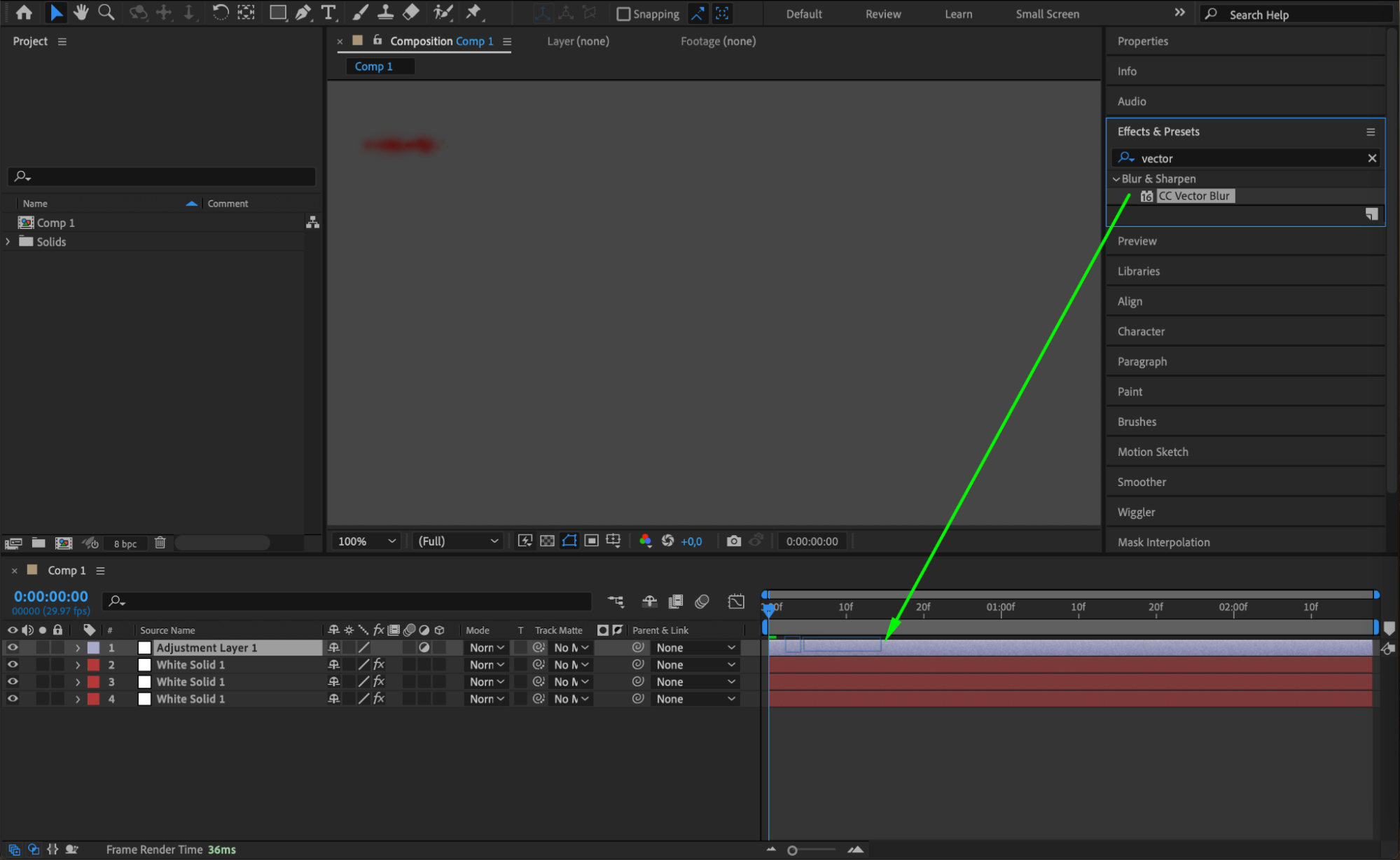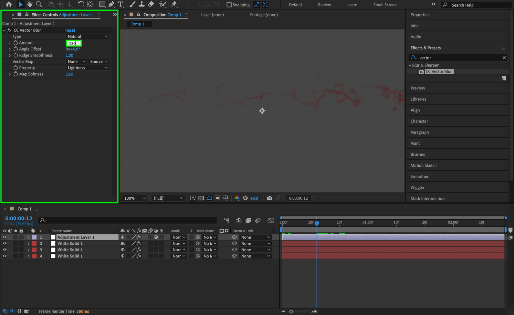 Create a new adjustment layer by going to “Layer” > “New” > “Adjustment Layer.” Apply the “CC Vector Blur” effect by going to “Effect” > “Blur & Sharpen” > “CC Vector Blur.” Set the Amount to 150 to create a blur effect that enhances the splatter’s appearance.
