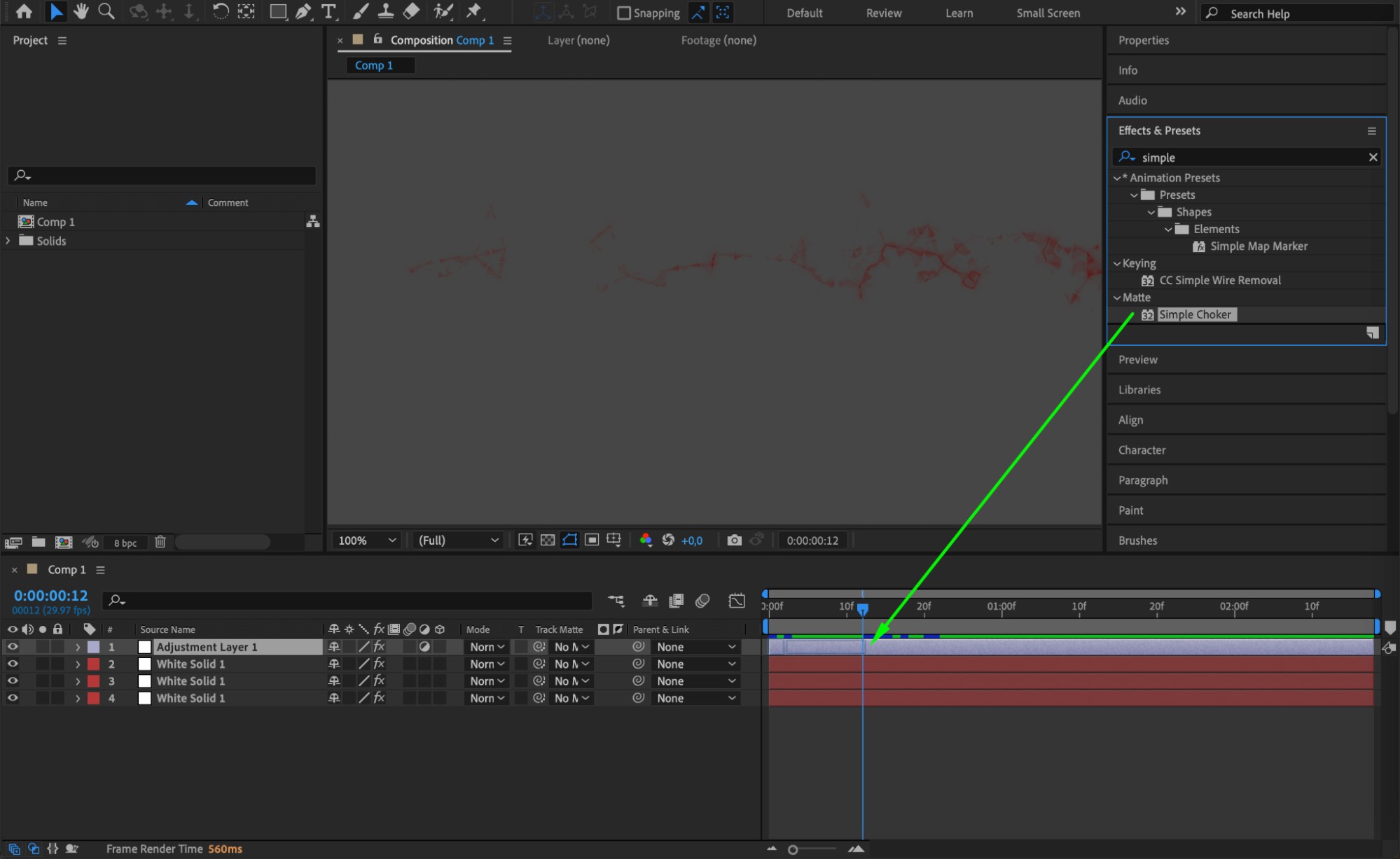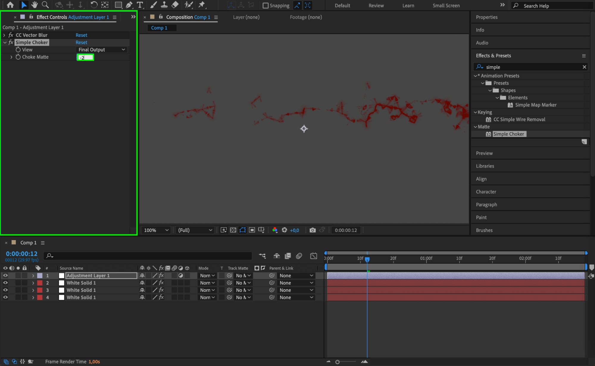 Add the “Simple Choker” effect to the adjustment layer by going to “Effect” > “Matte” > “Simple Choker.” Set the Choke Matte value to -2 to refine the edges of the blood splatter and make the effect look more organic.