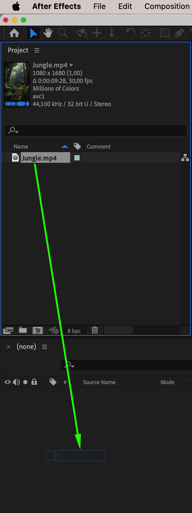 Open After Effects and import your video by navigating to File > Import > File. Select your footage and drag it onto the timeline to create a composition.