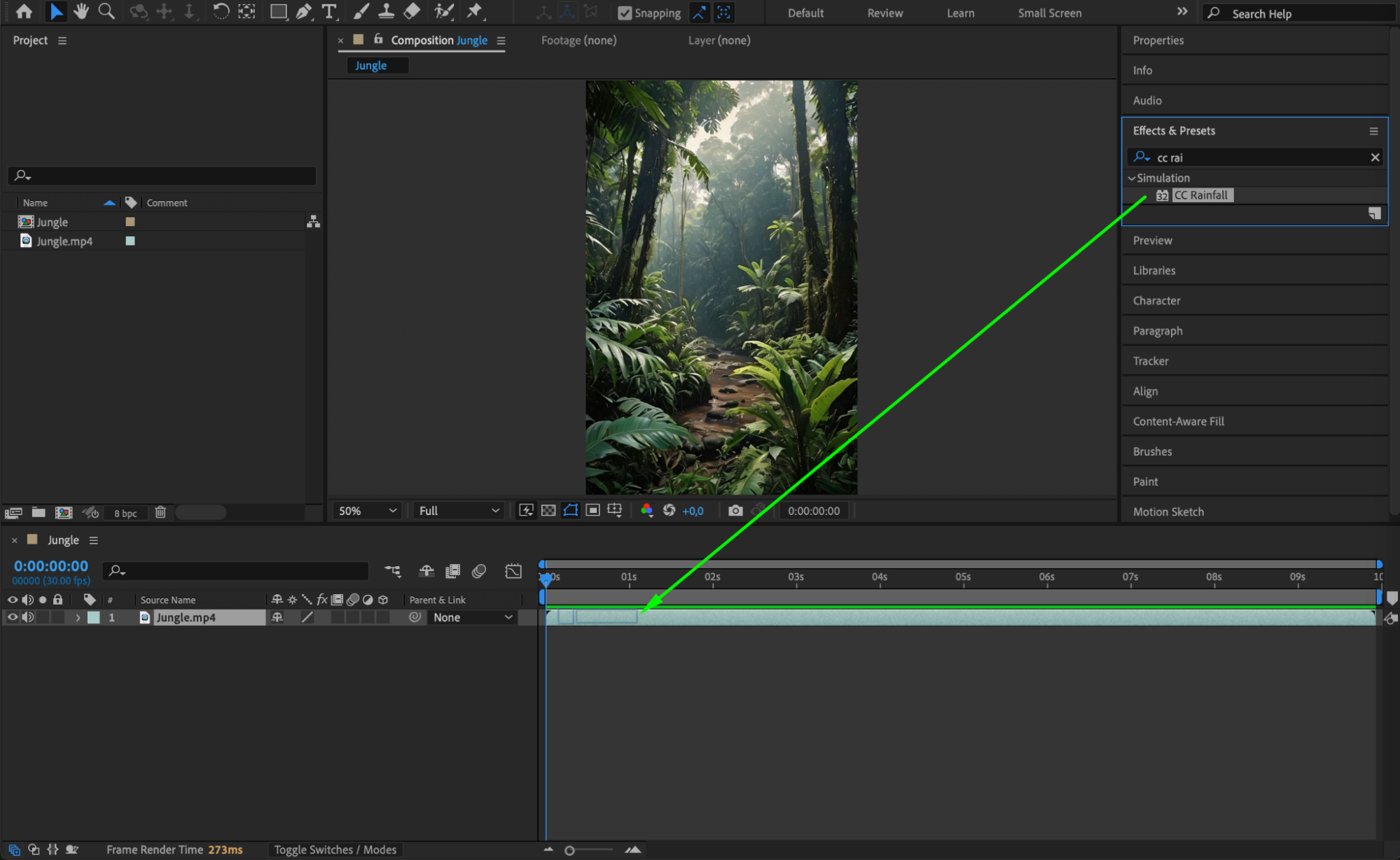 With the video layer selected, go to the Effects & Presets panel and search for CC Rainfall. Drag and drop the effect onto your video layer to apply the basic raindrop simulation.