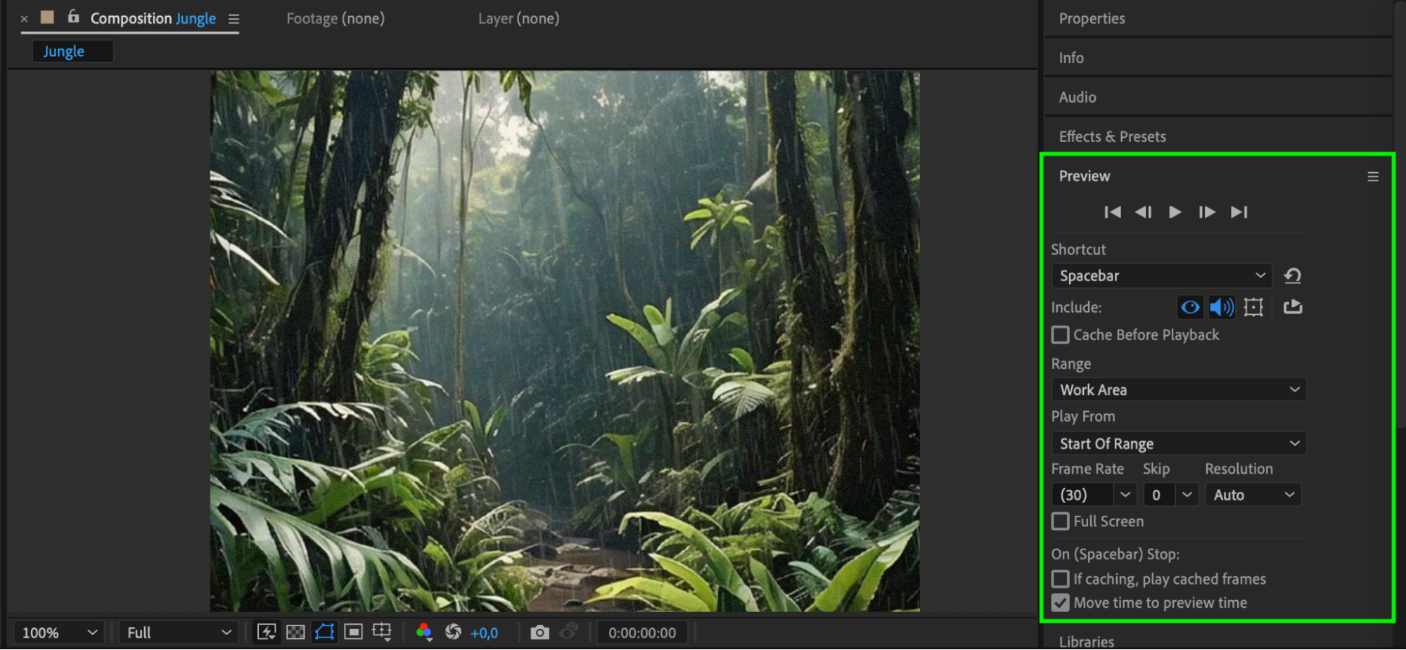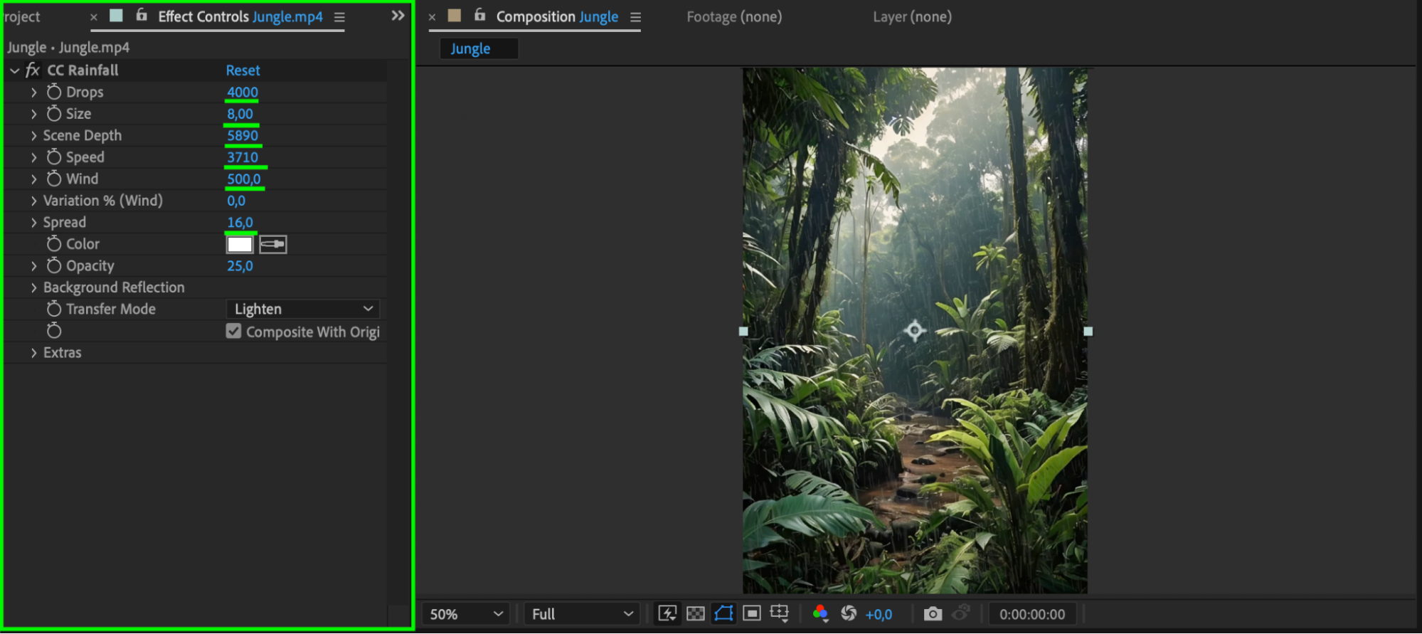 Press Spacebar to preview your animation and ensure the raindrops look natural in your scene. If needed, tweak the settings further for better integration with your footage.