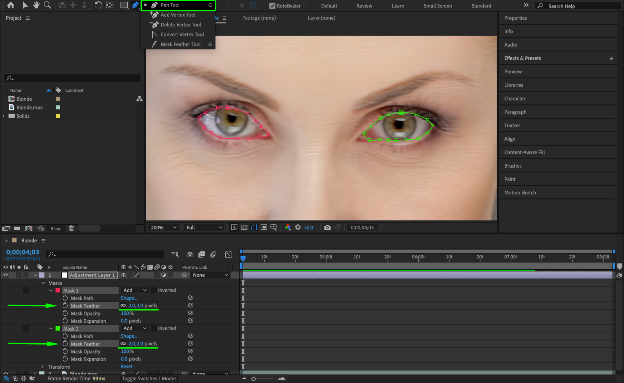 Select the Pen Tool (G) and carefully draw masks around both eyes to create a scary effect or around the irises for a colored contact lens effect. In the Mask settings, set Mask Mode to Add and Mask Feather to 2-4 pixels for a softer edge.