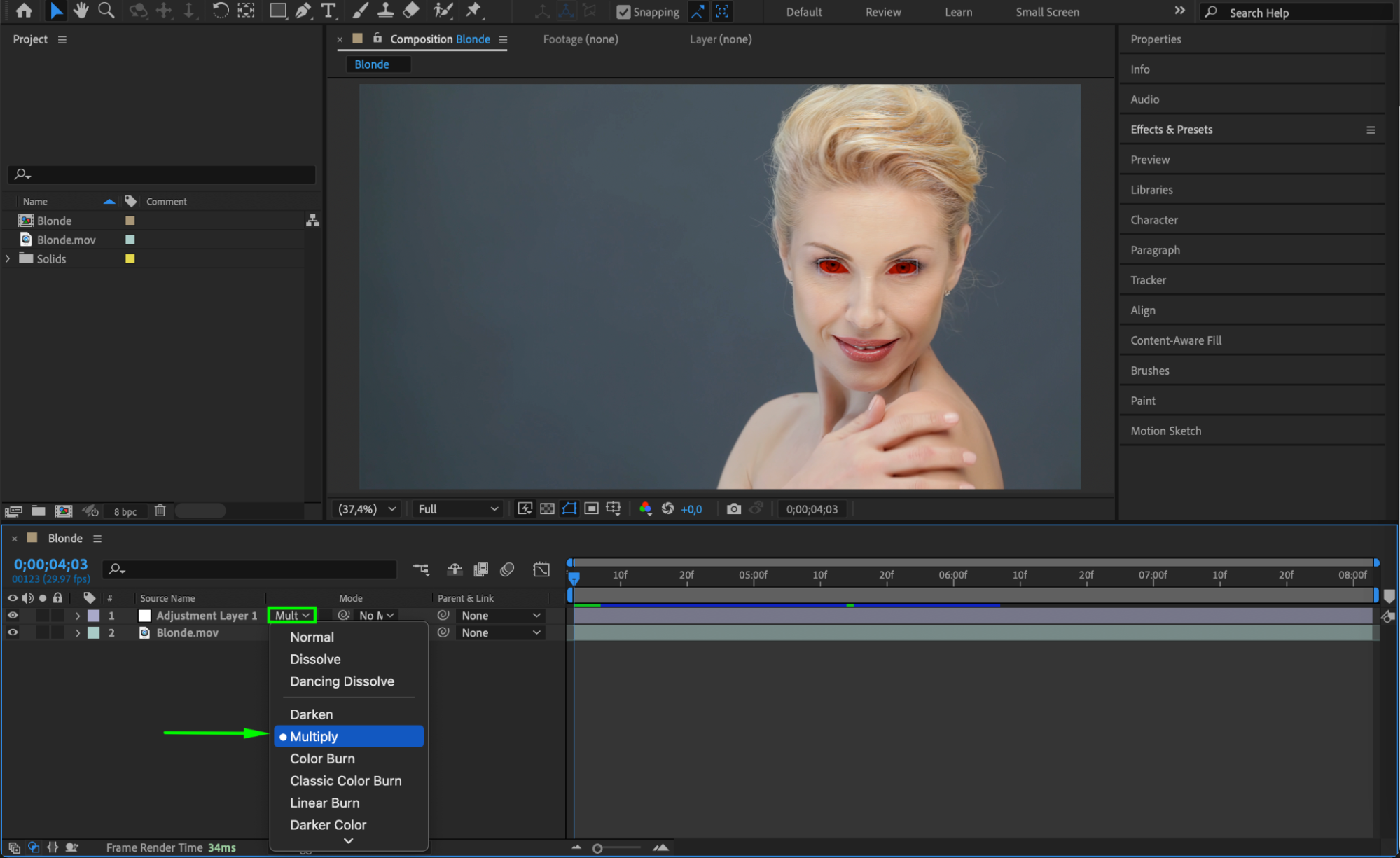 Select the adjustment layer and change its Blend Mode to Multiply in the Modes Panel. This helps blend the red color naturally with the eyes, making it look more integrated into the scene.