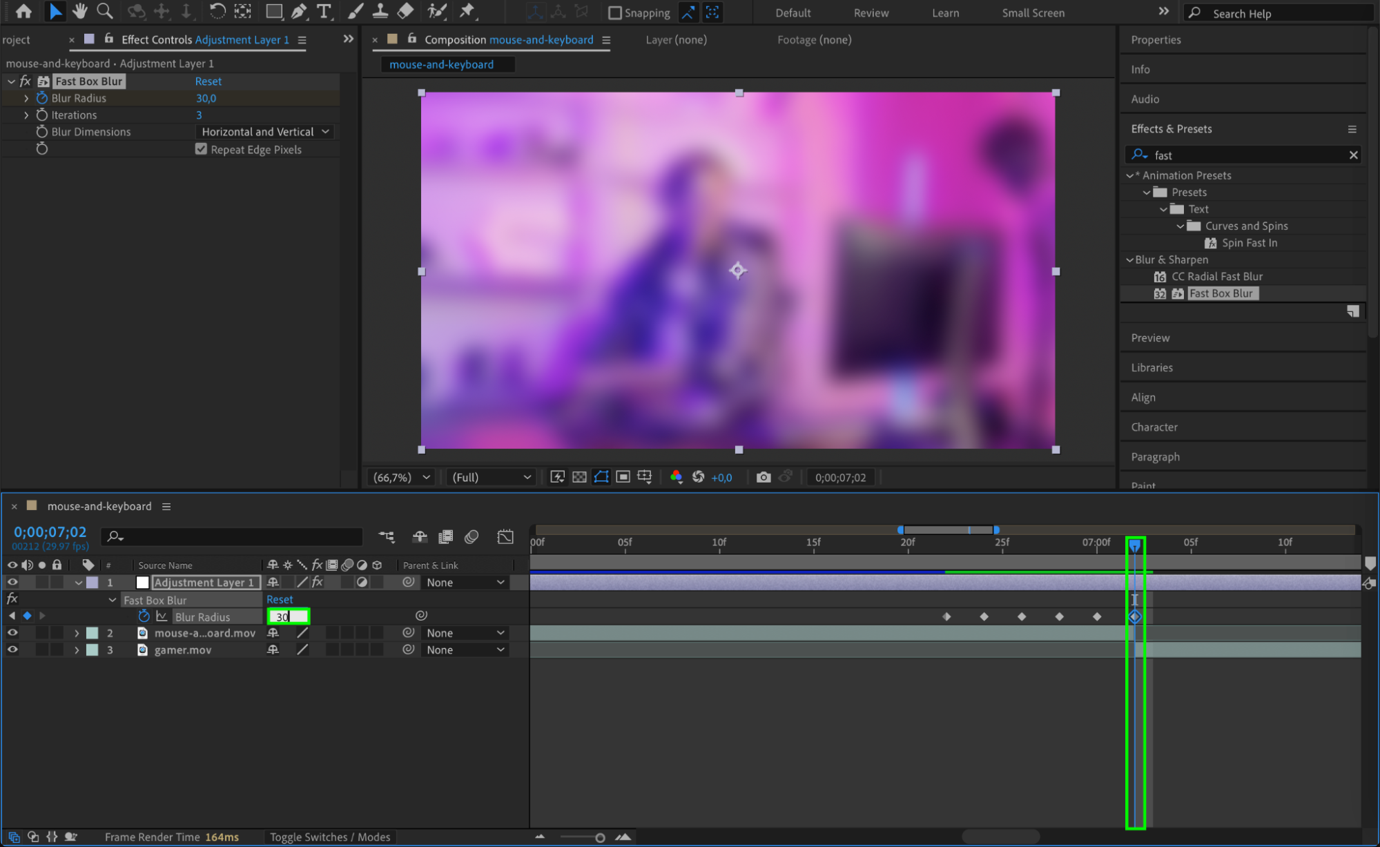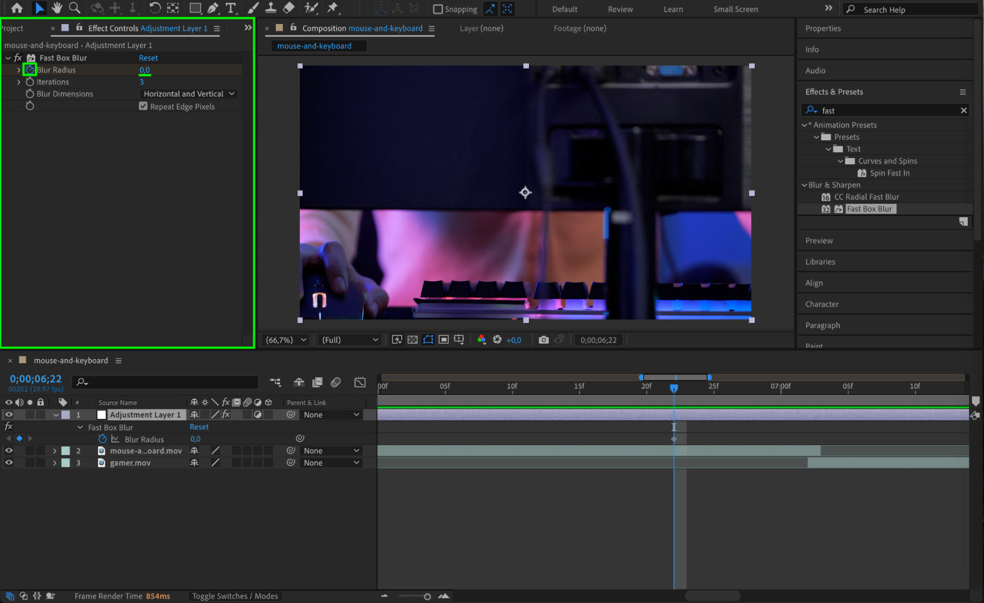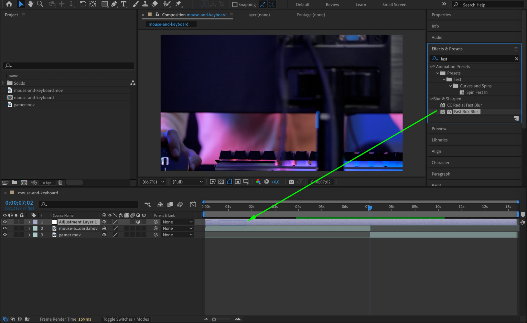 In the Effects & Presets panel, search for the Fast Box Blur effect and drag it onto the adjustment layer. This effect will blur the transition area between the two clips, creating a smooth transition.