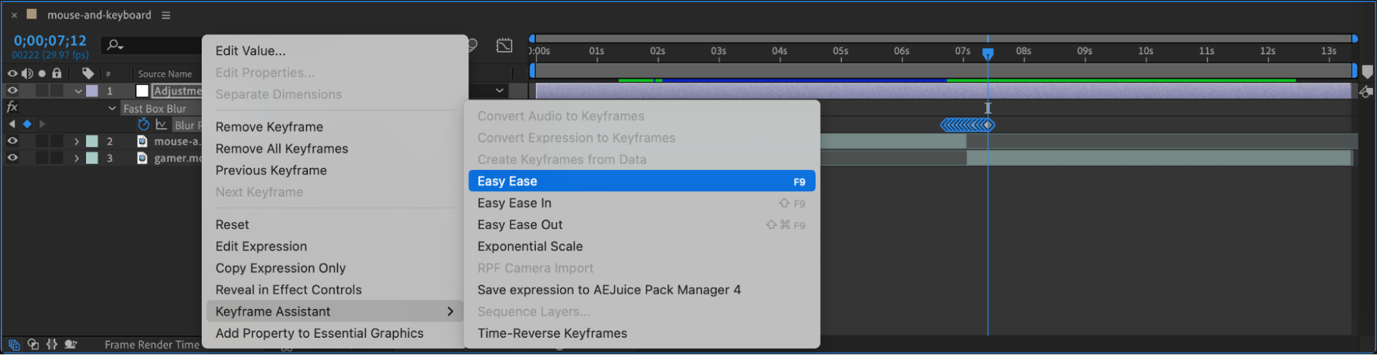 To make the transition smoother, select all the keyframes you created, right-click, and go to Keyframe Assistant > Easy Ease. This will adjust the motion curves, making the transition flow naturally.
